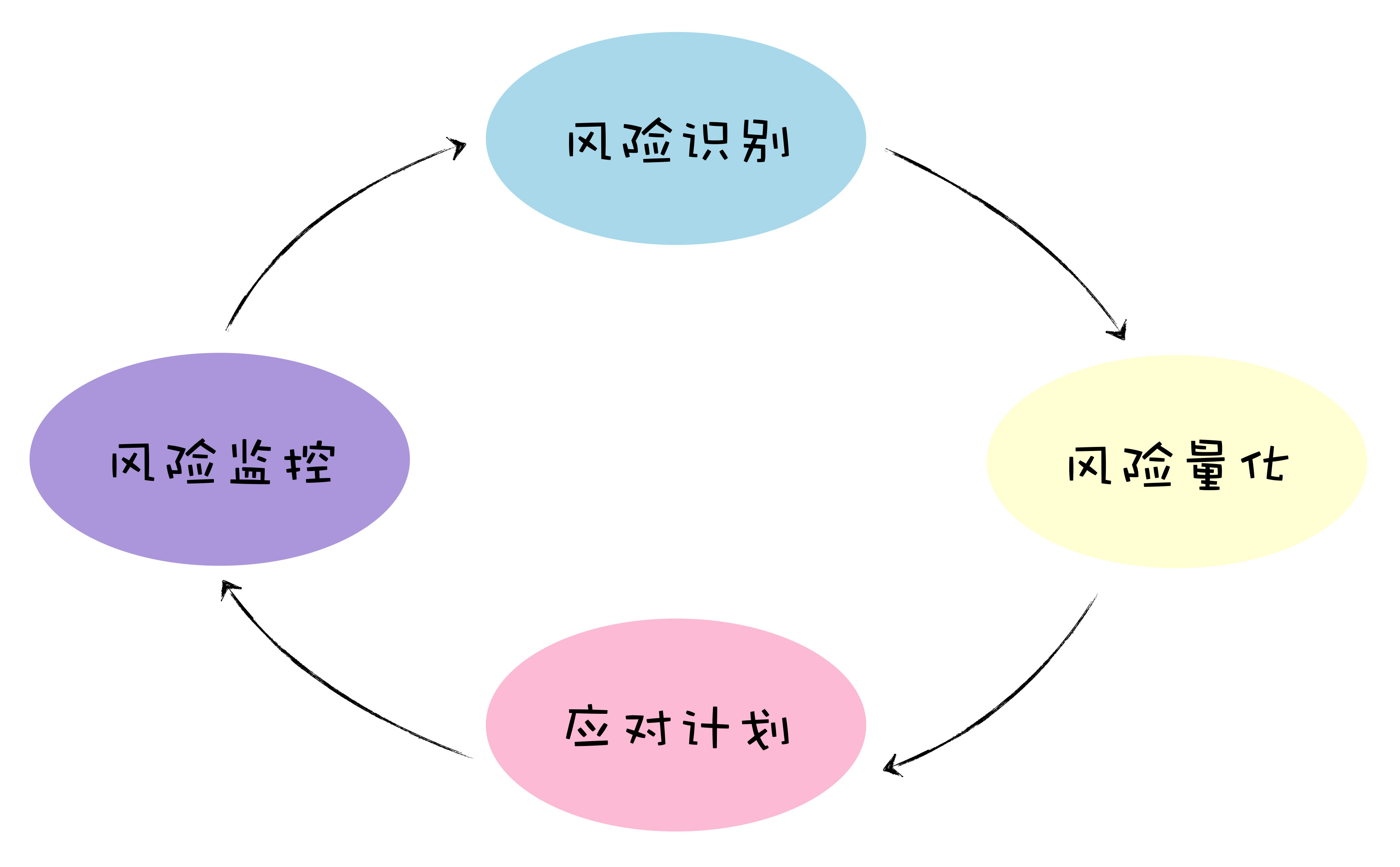 以上四个风险管理的步骤是一个连续循环的过程,在整个项目期间,都要持续地对风险进行识别,对风险量化,对于风险采取应对计划,对风险进行监控。