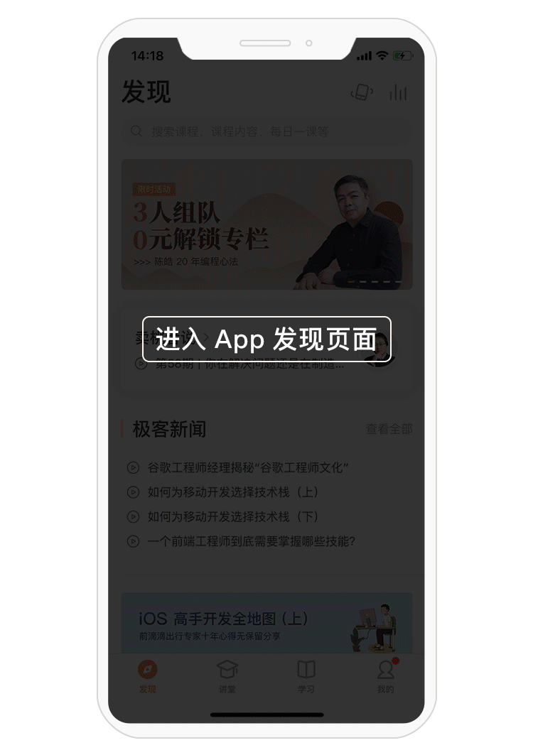 2、发现页和讲堂页我们都设置了搜索的入口,想找到任何你需要的极客时间内容,都可以通过搜索触达。你可以搜索到专栏和课程,也可以搜到文章、视频、卖桃者说、极客新闻、热点专题等内容。后续我们还会上线一个任意试读的功能,只要在额度范围内,搜索到的内容,都可以试读试看。