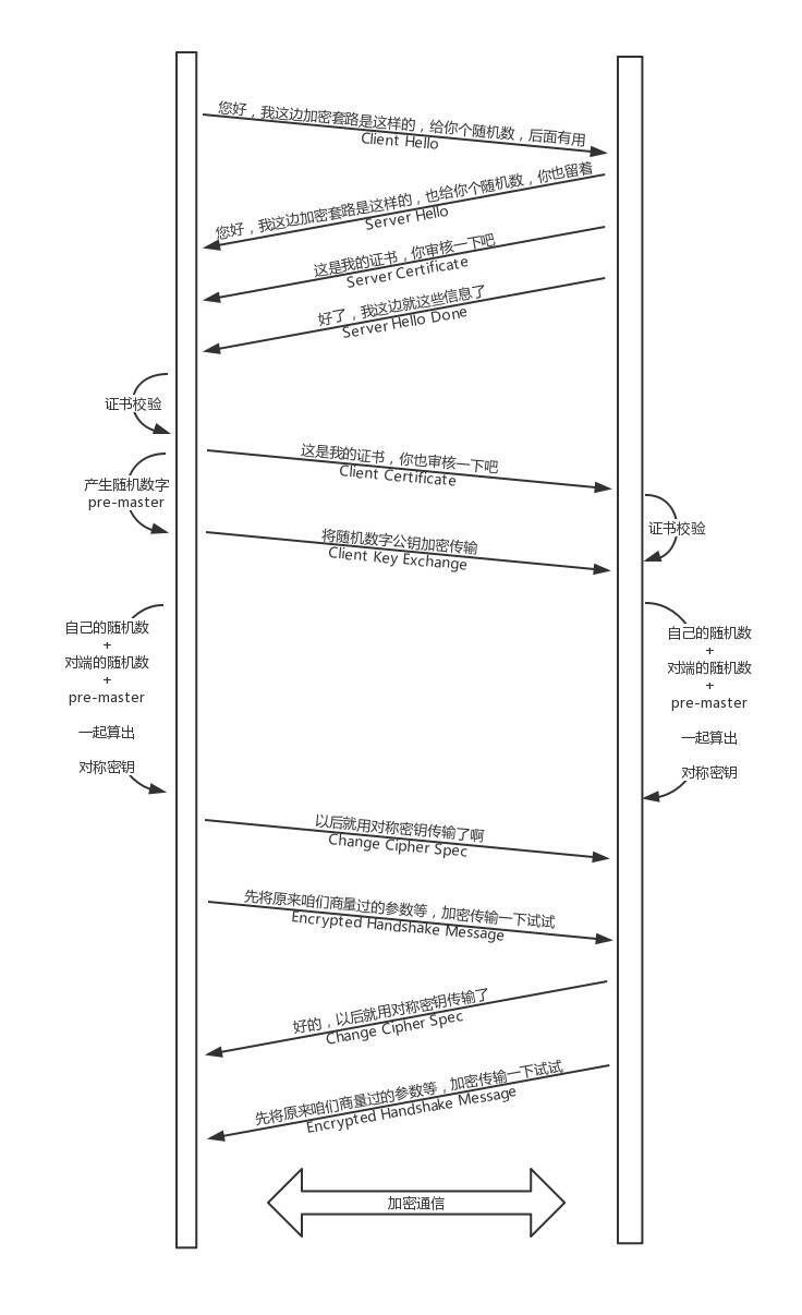 同样,服务器也可以发送Change Cipher Spec,说:“没问题,咱们以后都采用协商的通信密钥和加密算法进行加密通信了”,并且也发送Encrypted Handshake Message的消息试试。当双方握手结束之后,就可以通过对称密钥进行加密传输了。