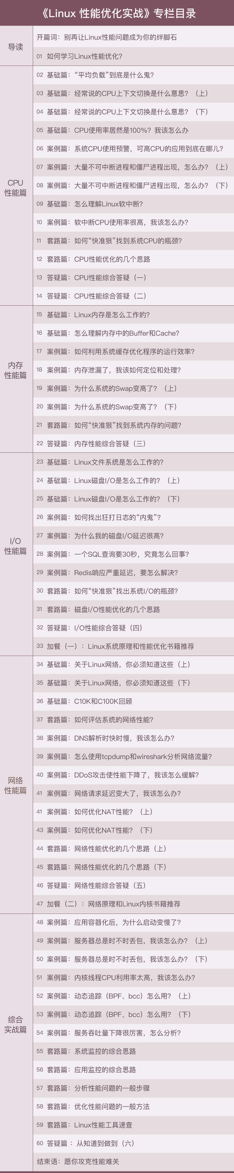 内容听完了,你对 C10K 和 C1000K 这个经典的问题应该有了更深入的了解,倪朋飞老师对 Linux 和 Linux 性能相关领域的理解非常深入,讲述思路清晰,帮助很多极客时间用户解决了他们实际工作中遇到的问题。目前已经有近 3 万人在学习这门课。如果你对 Linux 性能优化方面有困惑,那么《Linux 性能优化实战》一定很适合你。