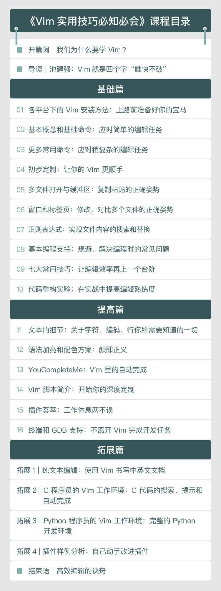 今天是《Vim 实用技巧必知必会》早鸟优惠价的最后一天,限时 79 元,用我为大家申请的优惠口令 MAITAO888,还能在优惠价的基础上再减 10 元,69 元订阅。8 月 1 日起,这门课就将恢复原价。我在文末给你放了一张 Vim 的课程目录,你可以看看是不是自己的菜。