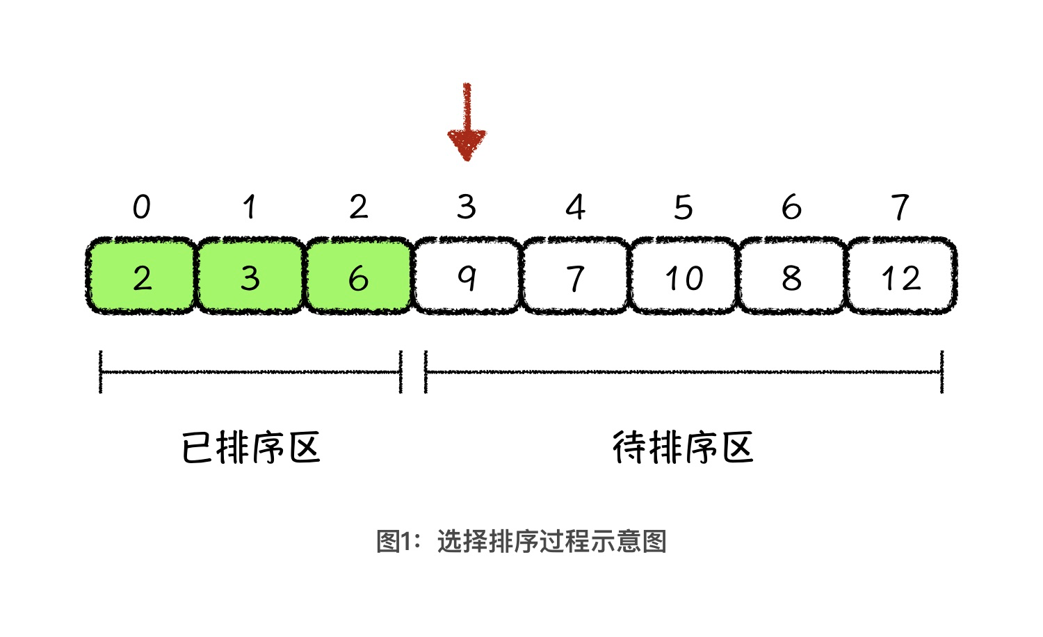 具体来说就是,用选择排序算法将数组中的元素,分成已排序区与待排序区。然后,每一轮从待排序区中选择一个最小值元素,放到已排序区的末尾,也就是待排序区的头部。这样,每一次的选择操作,都会使已排序区的长度增加一位,那经过 n-1 轮选择操作以后,整个数组就是一个有序数组了。