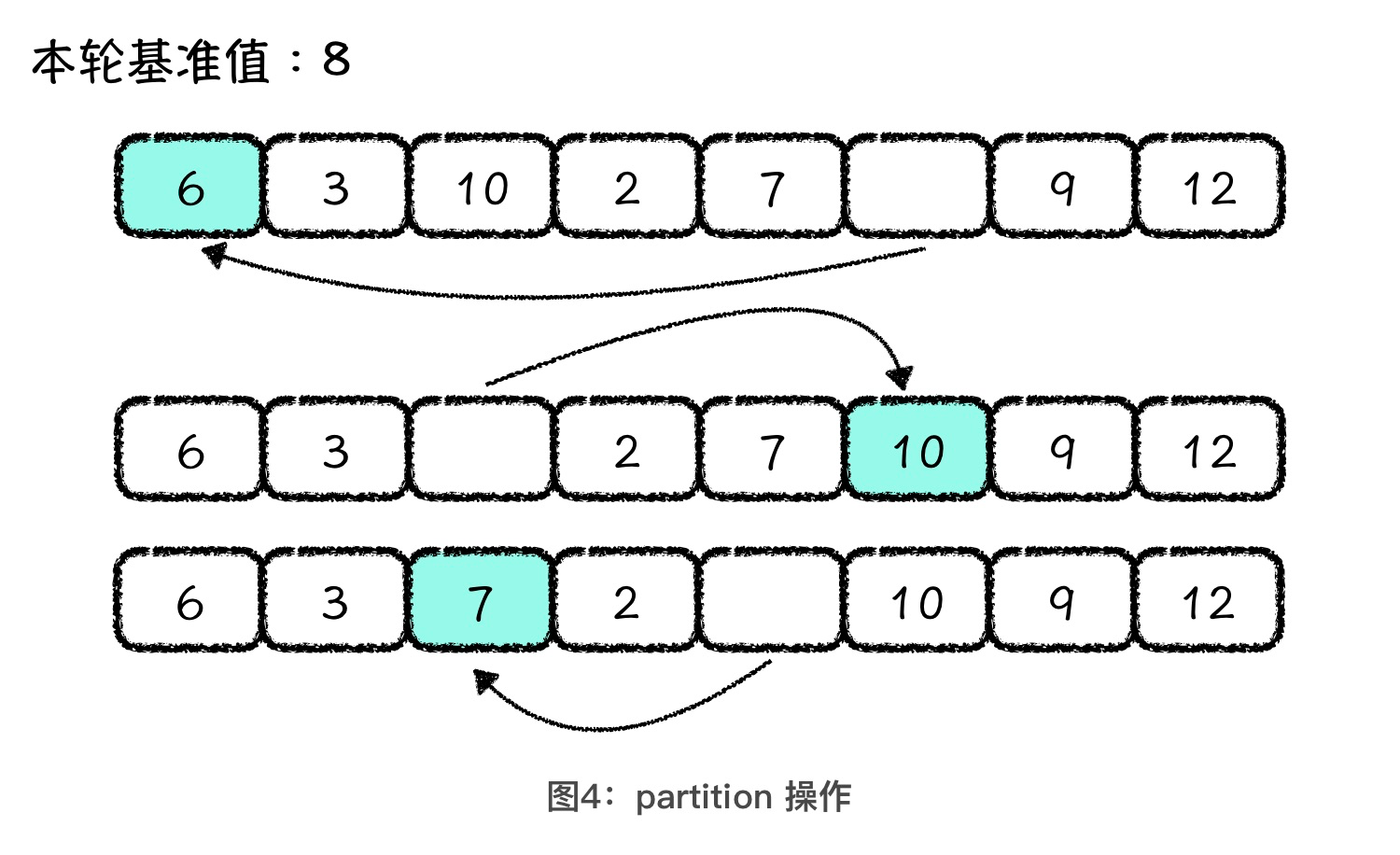 理解了 partition 操作的目的以后,我们再来讨论它具体是怎么做的。partition 操作简单来说,就是空出一个位置,反复地前后调换元素。这该怎么理解呢?首先,你要理解一点,当我们选择了基准值以后,原先基准值的位置就相当于被空出来了,也就是说数组的第一位是空着的。