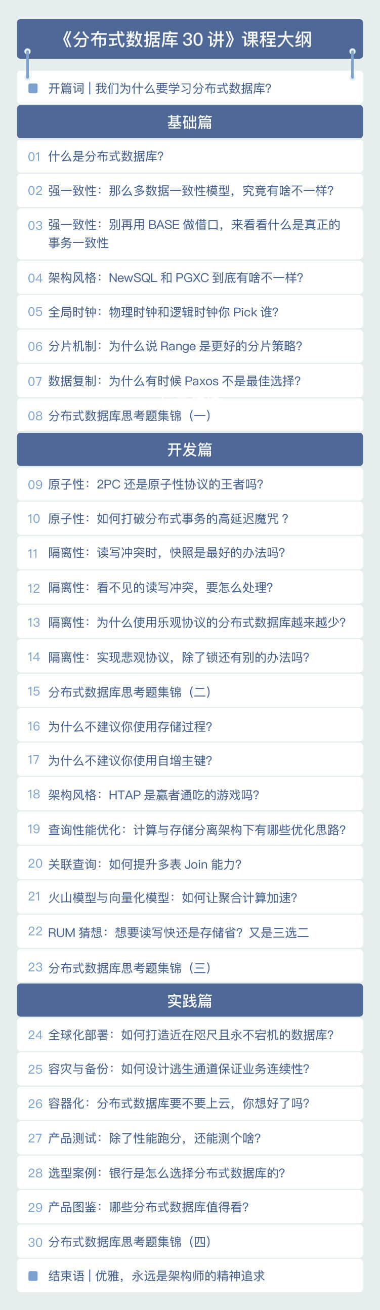 我会在基础篇为你讲解分布式数据库的基本概念、主流产品的架构风格、一些基本功能,以及分布式数据库设计的难点,帮助你建立对分布式数据库的整体认知。