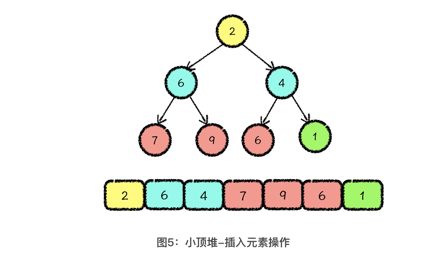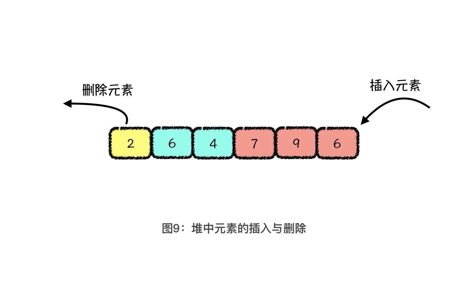 首先,我们先来回想一下堆实际的存储结构和结构操作。之前我们说过,它其实就是一个数组,在插入元素时,从数组的末尾放入元素,而删除元素时,是从数组的头部移出元素。