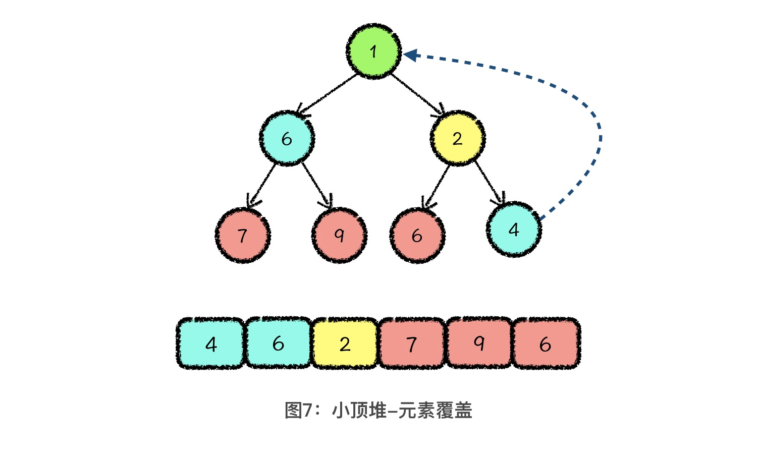 那为了保证删除最值元素以后,整个堆结构的存储还是从数组的第 1 位开始的,所以我们第一步要做的就是元素覆盖,也就是用堆的最后一位元素,覆盖掉堆顶元素。