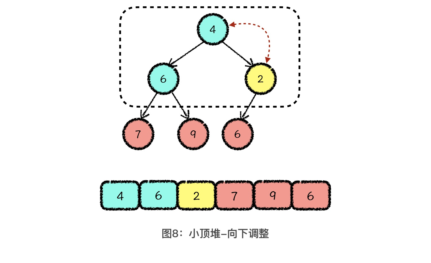 这里呢,我们就接着前面插入元素后的结果,来继续删除元素。从上图中你可以看到,我们使用数组中的最后一个元素 4,覆盖了堆顶元素 1。接下来,我们就需要通过适当调整,让它重新满足堆的性质。调整的方法其实也很简单,就是从堆顶位置开始,每次从当前元素所在三元组中找到一个最小值,与当前元素交换。交换后,让当前位置的元素继续和下面两个元素比较,如果这个三元组中依然有最小值,那我们就继续向下调整,直到当前元素是三元组中的最小值为止。操作过程非常简单,你看下面的示意图就可以理解了。