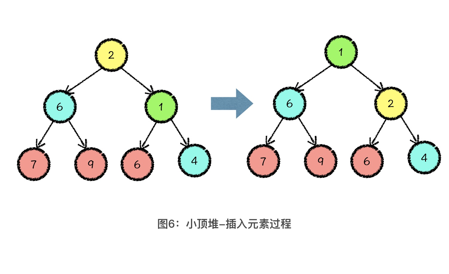 于是,针对这个小顶堆,我们通过 1 次 元素覆盖 和 1次 向下调整,就完成了删除最值元素的操作。到这里,我们就学完了二叉堆最基础,也是最重要的两个操作:插入和删除。是不是很简单?
