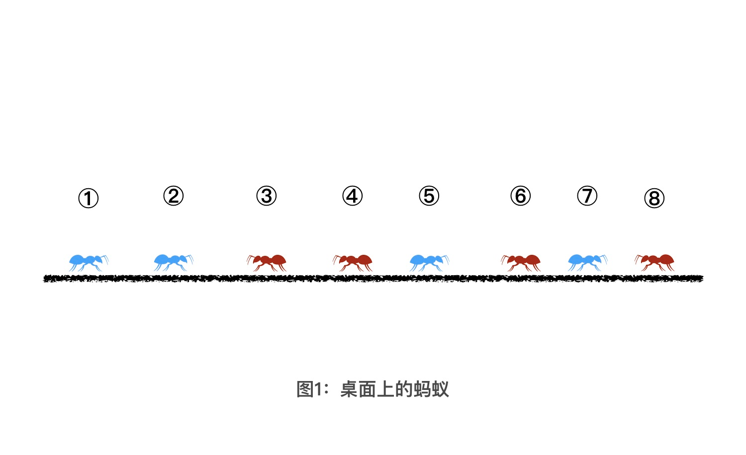 假设现在有一个水平面,上面有8只蚂蚁排成一排。方便起见,我们给所有的蚂蚁从左到右依次编号,编号为 1 到 8。从0秒开始,红色蚂蚁向左爬,蓝色蚂蚁向右爬,爬行的速度都是1m/s。如果有 2 只蚂蚁迎面碰到以后,这 2 只蚂蚁不会做任何的感情交流,而会立刻掉头向相反方向继续爬行。而爬行到桌子边沿的蚂蚁,会从桌子上掉下去。问:有哪些蚂蚁会从左边掉下去,又有哪些蚂蚁会从右边掉下去?
