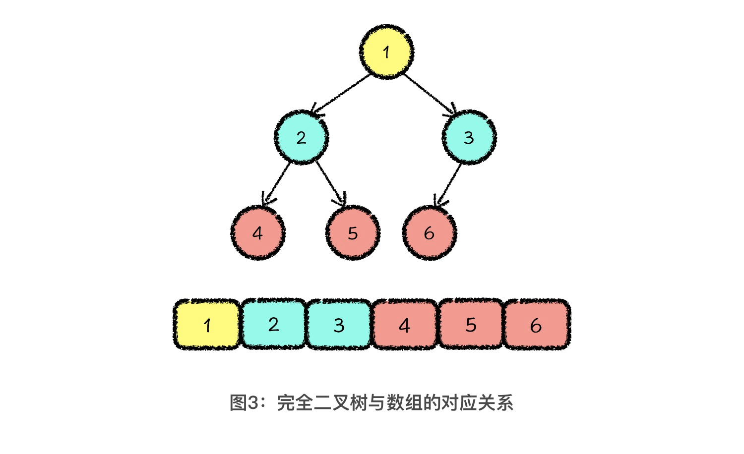 完全二叉树有一个很优秀的性质,就是可以被存储在一片连续的数组空间中。这怎么理解呢?还是看上面这个示意图,如果我们对它的每个节点进行编号,采用从上到下、从左到右的顺序依次标上 1 到 6。那么你仔细观察其中父节点编号与子节点编号之间的关系就会发现,如果父节点编号是 i,其左孩子的编号就是2 * i,右孩子的编号就是2 * i + 1。例如,我们以3号节点作为父节点,其左孩子的编号就是 2 * 3 = 6 号,如果有右孩子,那它右孩子的编号就一定是 2 * 3 + 1 = 7。