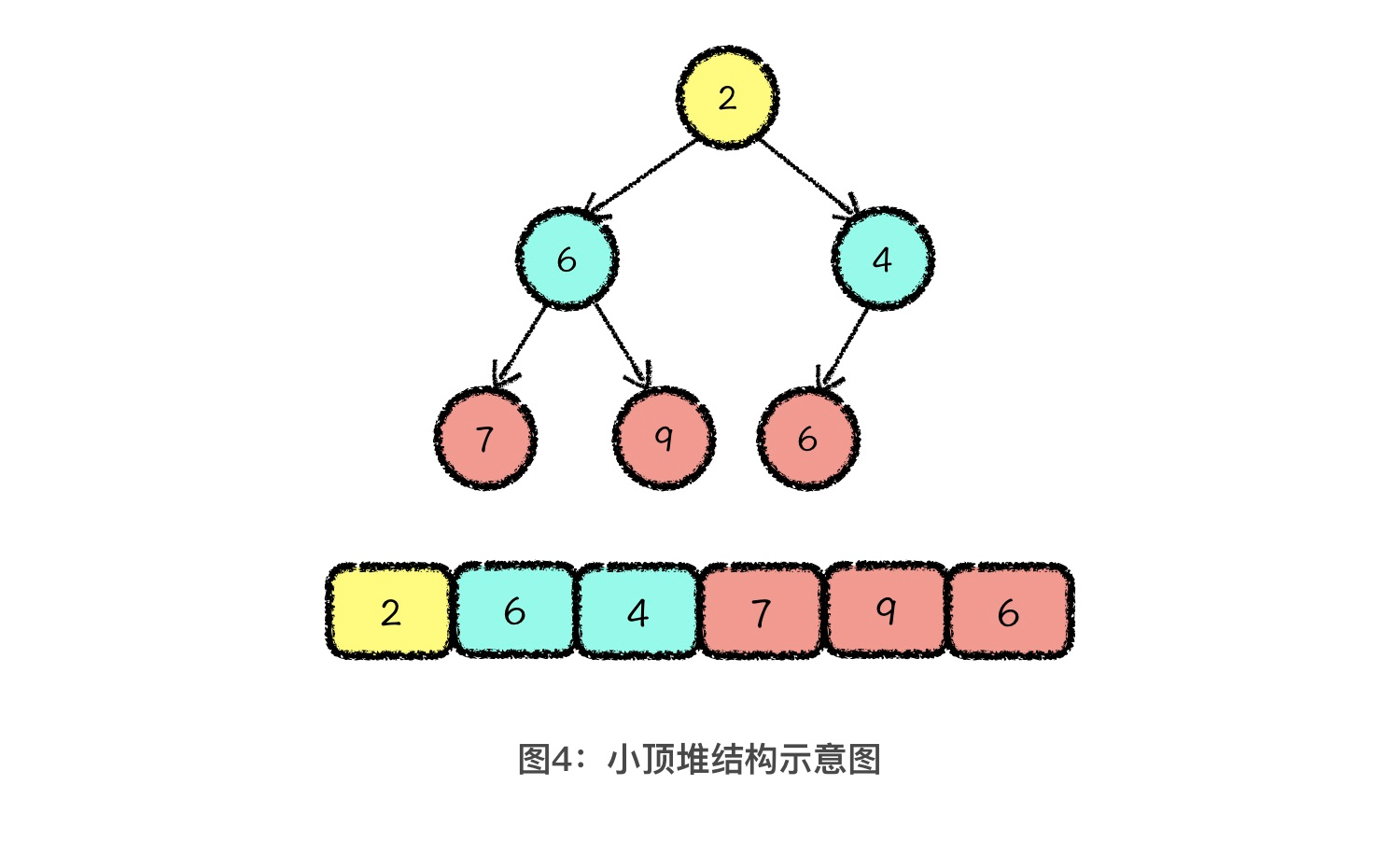 如果在一棵完全二叉树中,每个父节点的值都要小于其两个子节点的值,我们就管这种结构叫做小顶堆。相对应地,大顶堆就是每个父节点的值要大于其两个子节点的值。今天呢,咱们主要拿小顶堆做说明,因为小顶堆学会了,大顶堆自然不在话下。下图就是一个小顶堆的示意图。