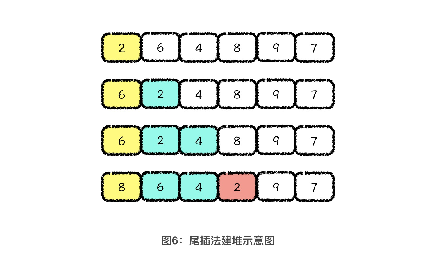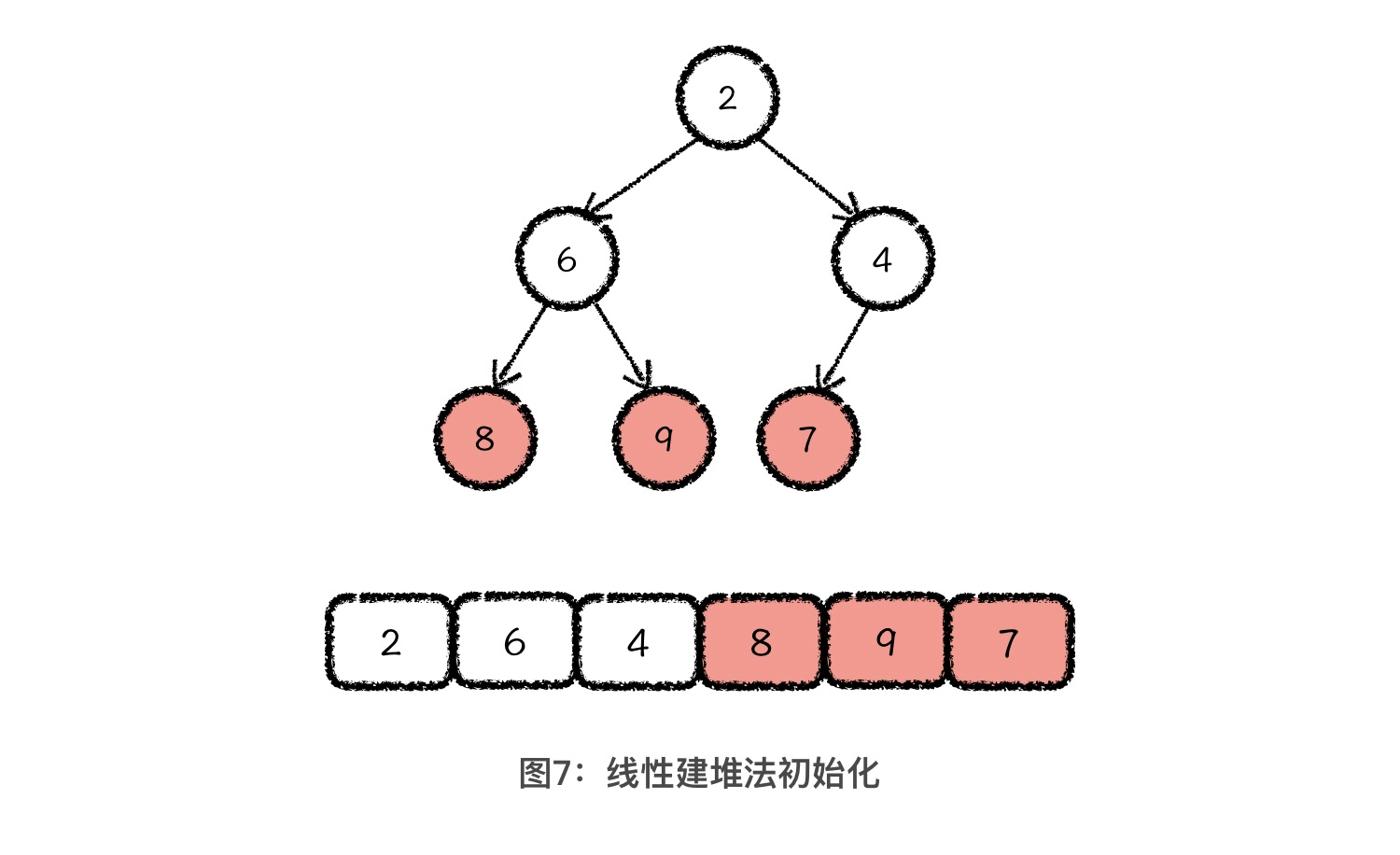 因为在上图这个数组中,处在堆中最下一层的 8、9、7这 三个节点,已经无法向下调整了,所以我们在初始化的时候,就直接把它们三个当成是已经调整好的堆结构就好了。之后,我们从元素4开始,向前依次将4、6、2三个元素进行向下调整,插入到他们下面的堆结构中。具体的过程,你直接参考正常的堆结构向下调整过程就可以理解了,我就不细说了。