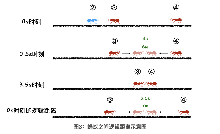 需要注意的是,两只蚂蚁在时刻 0 时的相对距离,不是指时刻 0 时这两只蚂蚁的真实距离,而是逻辑距离。这两个距离有什么不同呢?我们还是通过一个具体的例子来理解。
