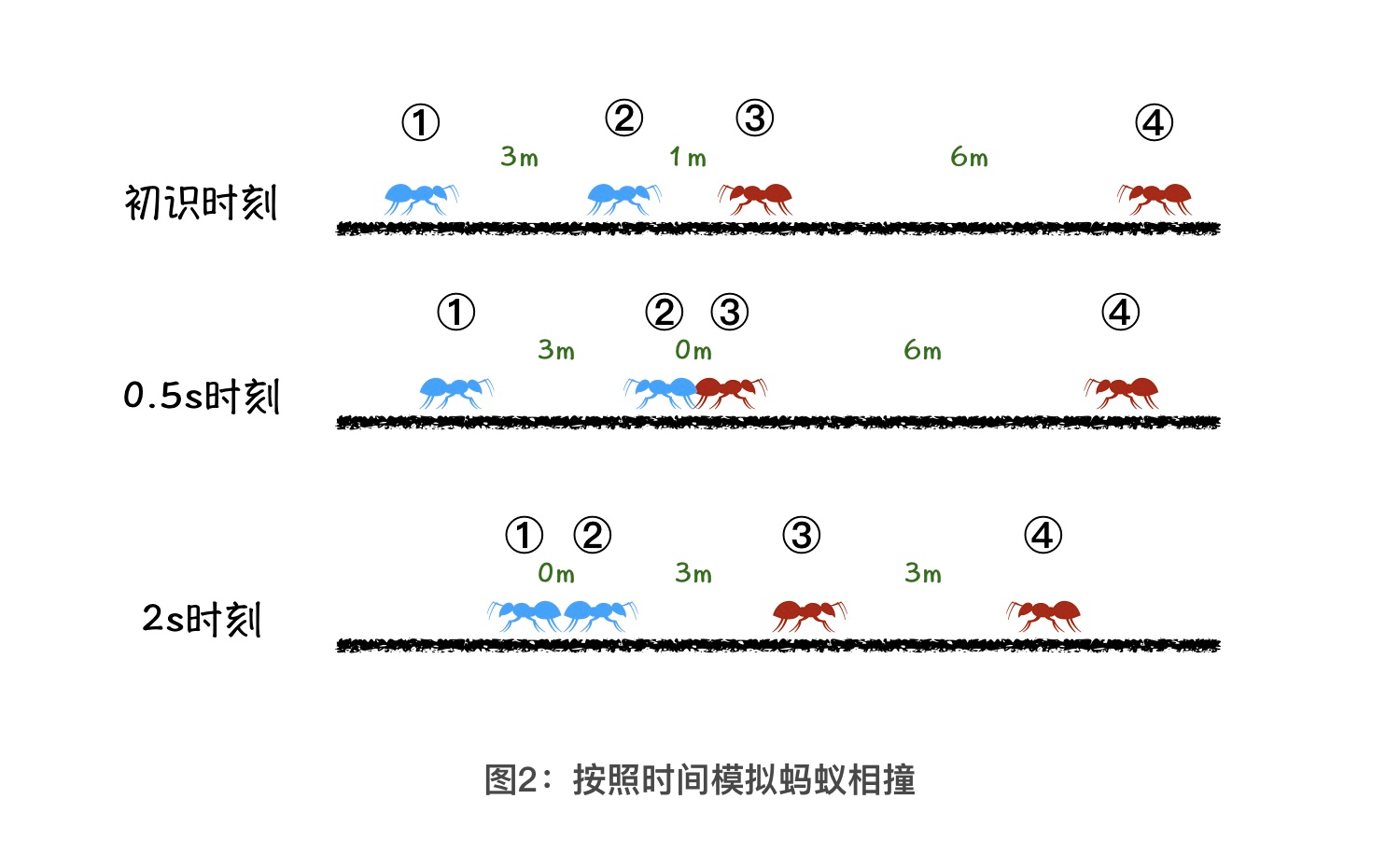 这个时候,1号和2号方向相对、3号和4号方向相对,并且1号和2号距离最近。所以下一次最先相撞的,应该是在1、2号蚂蚁.通过计算我们能知道,它们会在 2s 的时刻相撞。相撞之后,2、3号蚂蚁同向而行,3、4号蚂蚁相向而行。