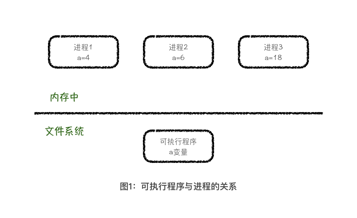 具体我们来看一个例子。假设,进程 1、2、3 对应了同一个可执行文件的运行结果,并且均包含一个变量 a。但是, 3 个进程中的 a 变量并不相同,它们都存储在内存不同的地方,所以这 3 个进程之间的运行,并不会受到对方的影响,每个进程都有一片自己独立存储数据的空间,因此,进程是操作系统分配资源的最基本单元。