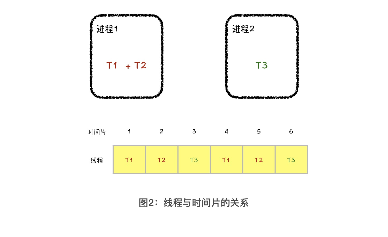 你会看到,图中有T1、T2、T3 这 3 个线程,它们依次占用 CPU 的每一个时间片。这样,一个时间片就唯一对应到了一个线程,CPU 到了新的时间片就会切换去执行新的线程。这样,你应该就能理解,线程是操作系统进行计算调度的基本单元。
