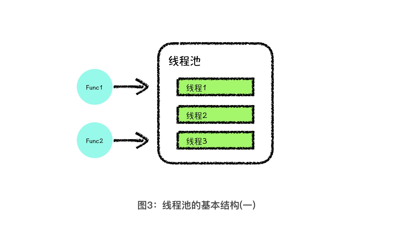 接下来,我就以装有3个线程的线程池为例,来和你讲讲线程池的基本结构。
