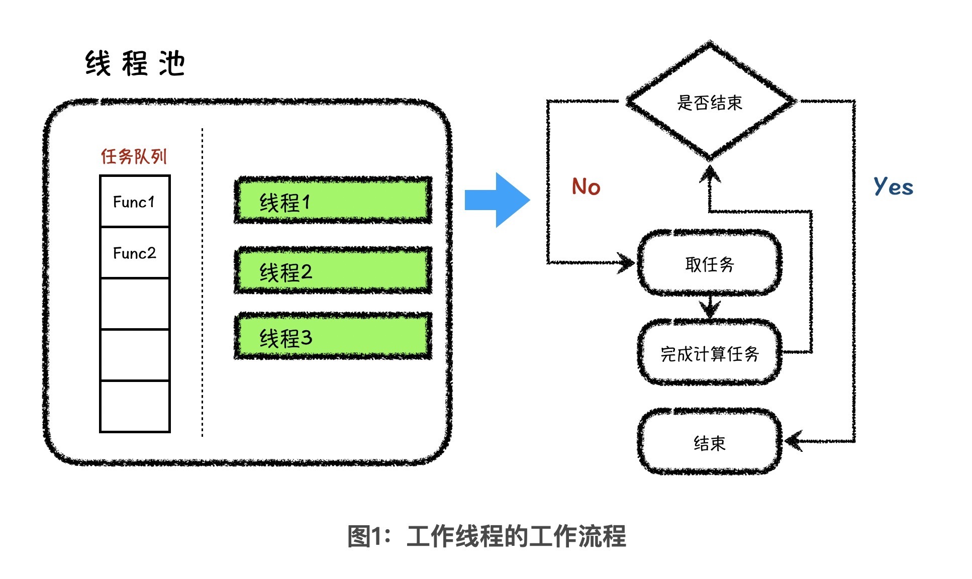 今天,我带你完成了线程池的初步封装。这一份线程池代码中还有很多不够优美的地方,如果你精力比较充沛,可以试着改进一下这个线程池的功能设计与封装形式。如果你之前没有接触过这类项目,那现有的代码以及封装逻辑也足够你学习了。