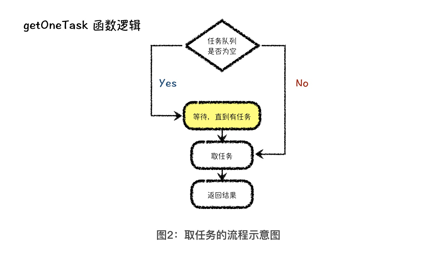 从图中,我们可以看到,在取任务的逻辑中,我们需要先判断任务队列是否为空。如果是空的,取任务的方法会等待在原地,直到任务队列中有任务,再取出任务向下执行。那该如何等到任务队列中有任务呢?这一步非常复杂,而且也不是我们课程的讲解重点,所以,我们不做重点讲解,如果你有兴趣深入了解,可以去检索这些关键词:多线程同步方法、条件变量、互斥锁、信号量和无锁化编程。