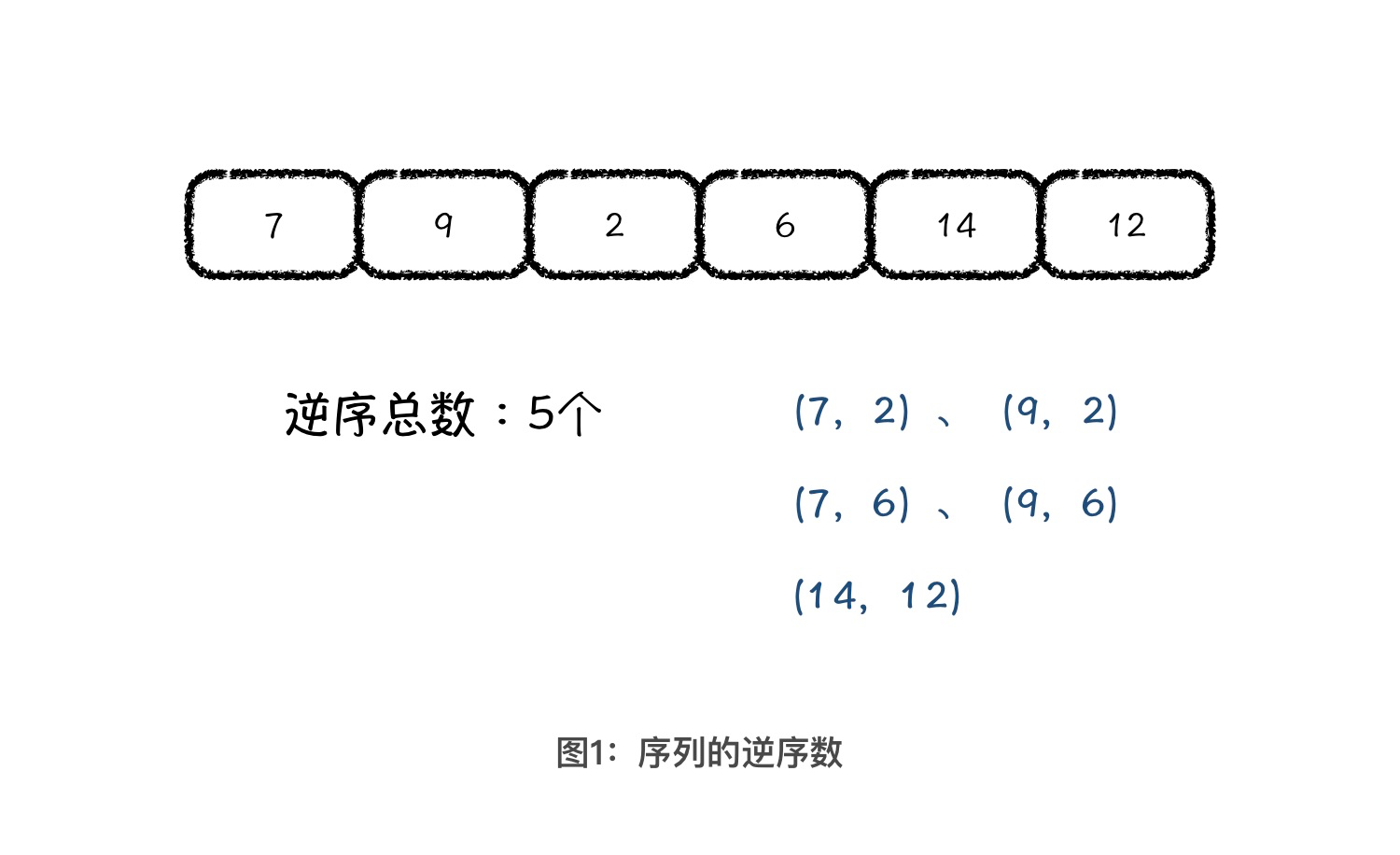 我们看下面这个序列,根据逆序数的定义,序列中逆序的个数有 5 个,分别是(7,2)、(9,2)、(7,6)、(9,6)和(14,12)。