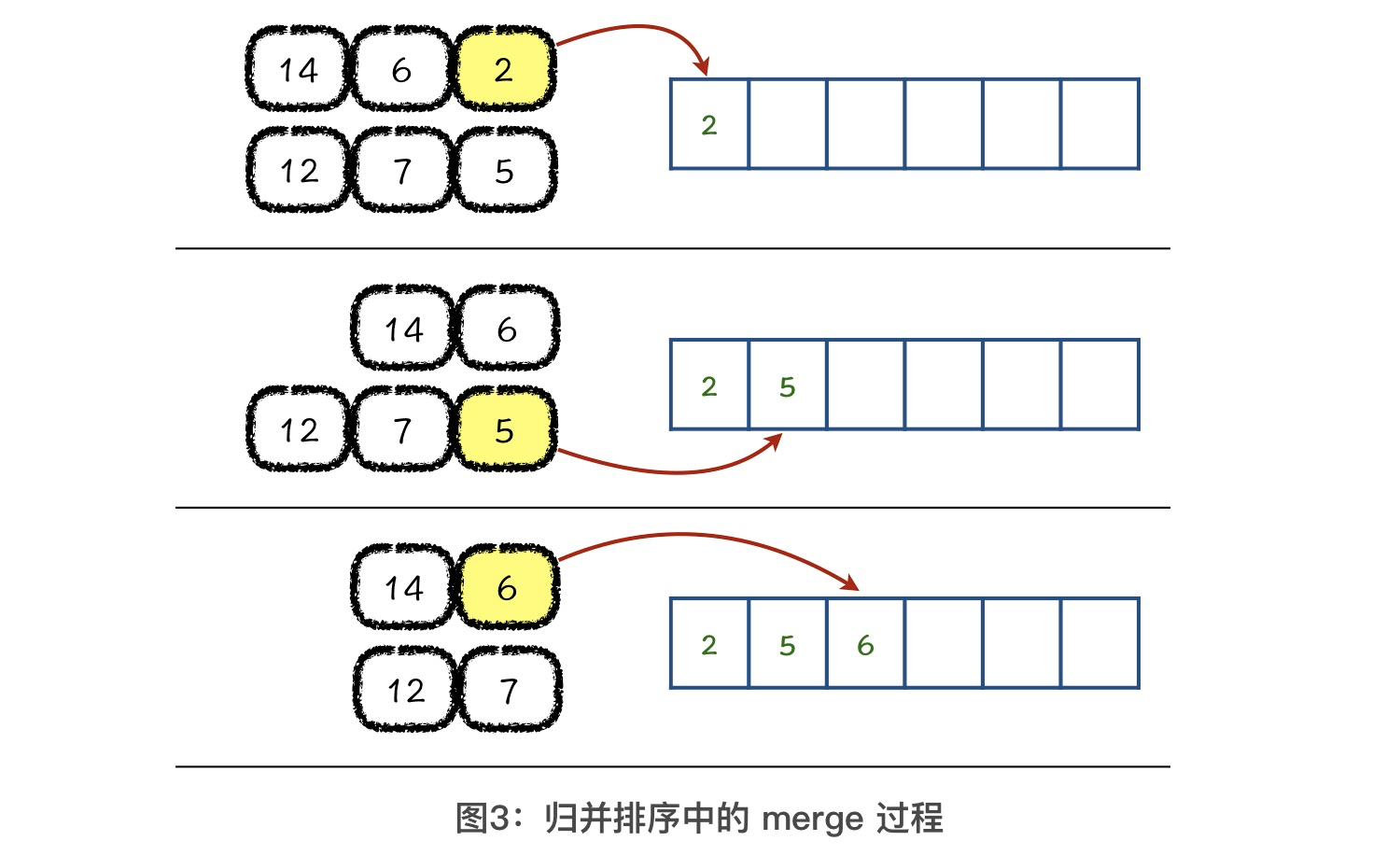 将两个有序数组合并成一个有序数组的过程中,我们可以每次选出两个有序数组中最小的元素,把它放到结果数组中,当两个有序数组中的元素都被取干净以后,merge 过程就结束了。