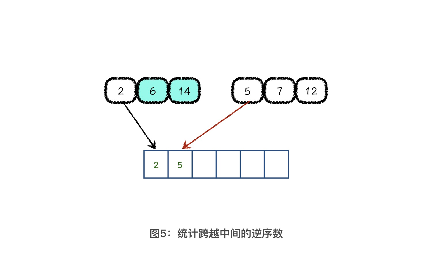 现在,这个序列有 7、9、2、6、14、12这6个数字,我们把它们按顺序平均分成两部分。这样,左半部分逆序数是2个,右半部分逆序数是 1个,跨越中间的逆序数是 2 个,所以整个序列的逆序数就是 5 个。