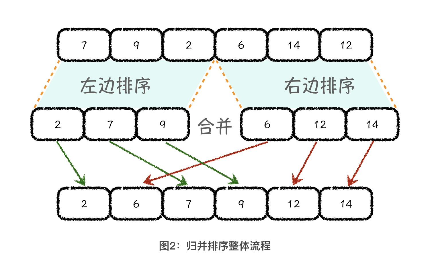 从代码中,我们可以看到,实现归并排序的重点就是 merge 方法,也就是将两个有序数组合并成一个有序数组的过程。下面,我们就来重点讲解一下这个合并过程。