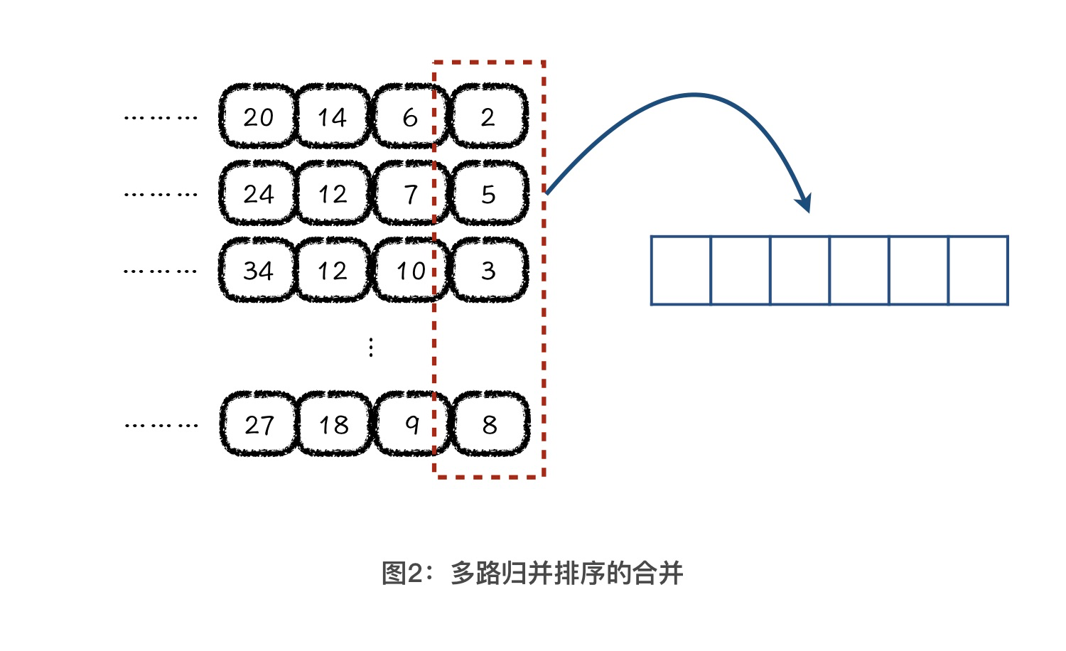 我们先回忆一下,二路归并排序算法的合并过程。在将两个有序数组合并成一个的时候,每次我们都是在两个数组头部选取一个最小值放入到合并数组中。因此,多路归并排序算法就是将多个有序数组合并成一个,在合并的过程中,每次从多个数组的头部选择一个最小值加入到合并数组中。这里的数组,你可以理解成是文件或者集合。