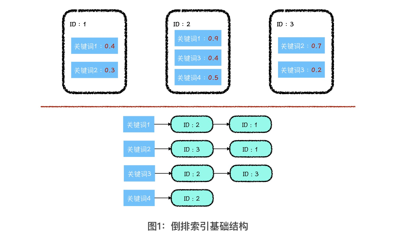 倒排索引就是以关键词作为索引项,再把与关键词相关的网页按照其与关键词的相关程度,从高到低排序所形成的索引结构。这句话比较绕,具体的你可以参考上图进行理解。
