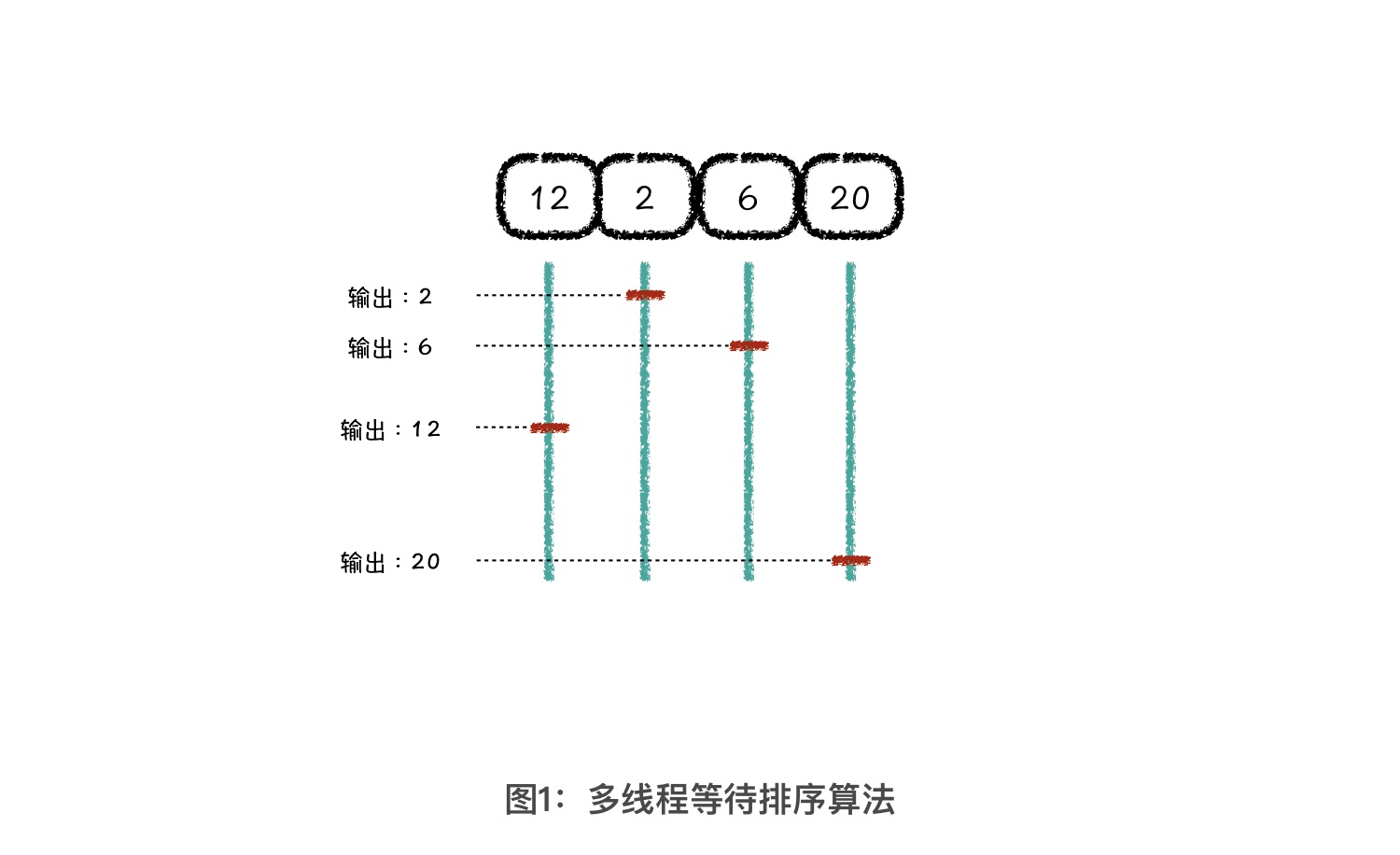 比如说,如果我们要对 4 个数字 12、2、6 和 20 排序的话,就启动 4 个线程。这4个线程分别是在2秒的时候输出2,在6 秒的时候输出 6,在12 秒的时候输出 12 以及在20 秒的时候输出 20。数据输出的时间顺序,就是我们要的数字排序顺序。