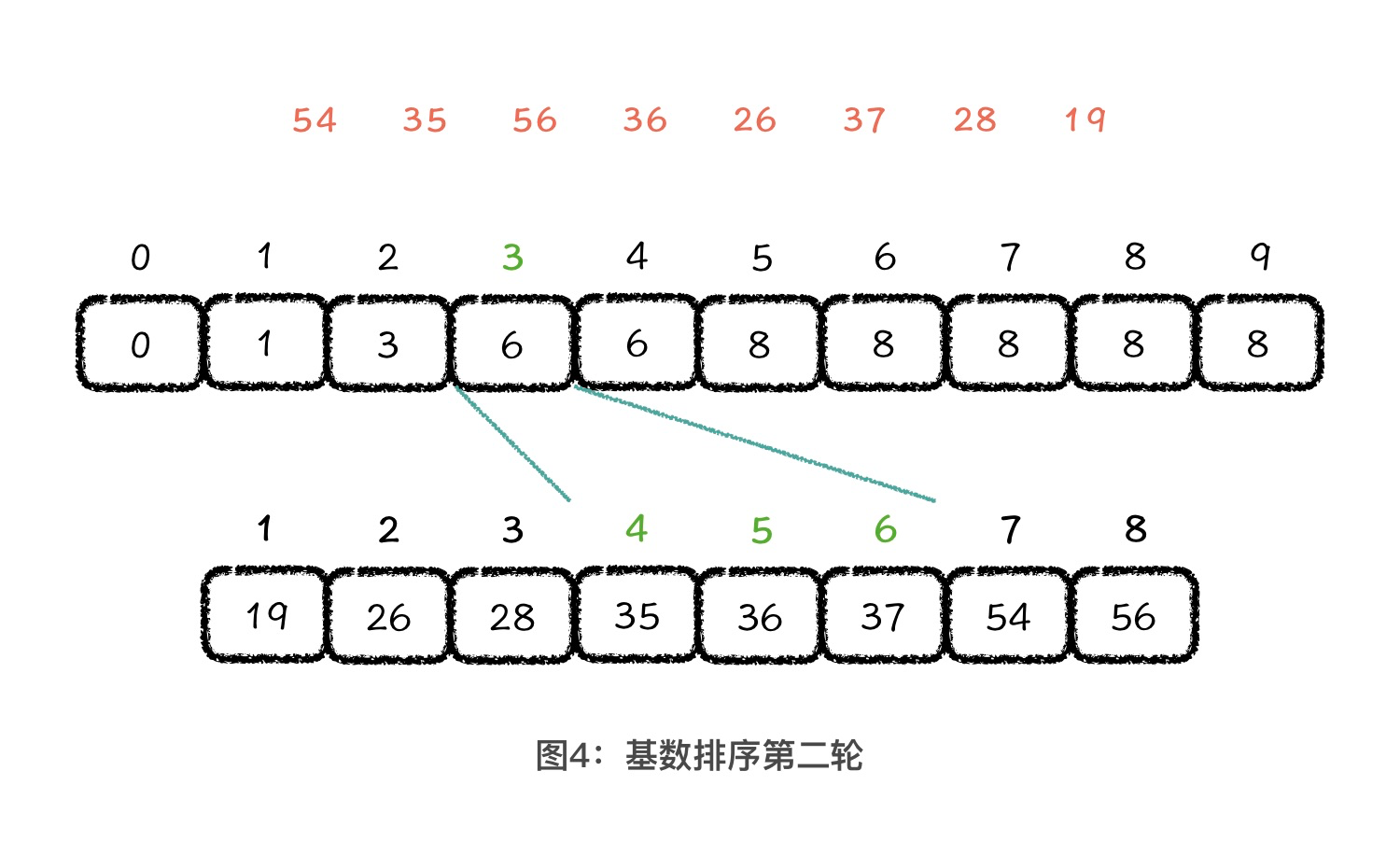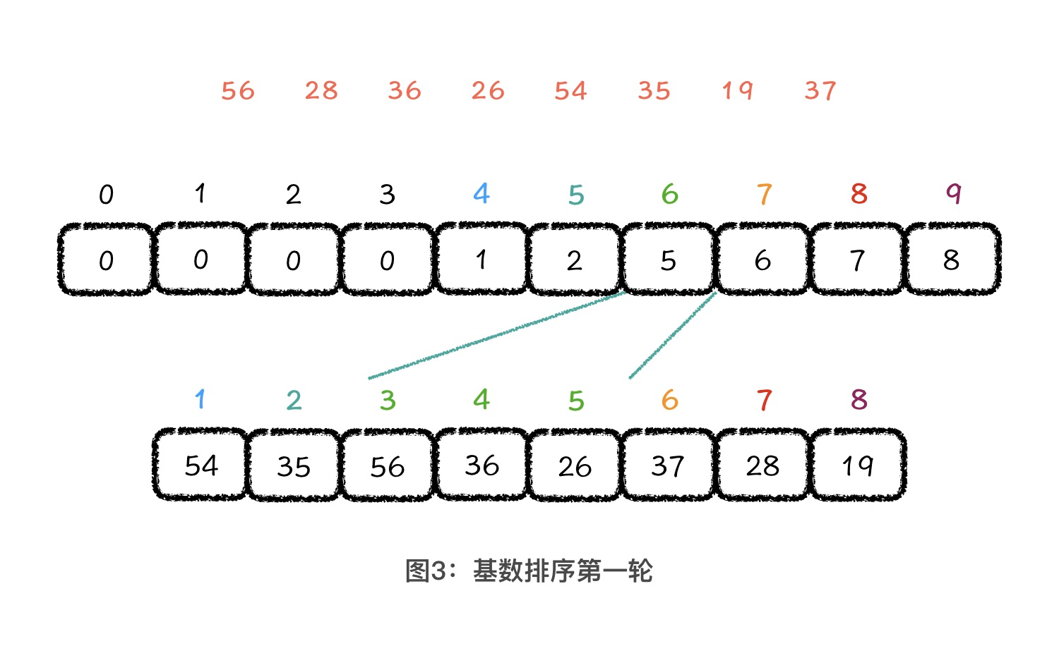 如图所示,我们还是分成两步来做,第一步是统计每一种数字出现的个数,以及求个数的前缀和。第二步,就是对每个数的十位数字,将原序列中的每个数字,放置到结果数组中,并且保持相同数字的相对位置不变。例如,其中十位数字是 3 的 3 个数字分别是35、36、37,只要我们保持三者在原序列中的相对位置不变,就能保证三者之间的顺序。因为,在第一轮按照个位数字排序的过程中,35一定排在 36 前面,36也一定排在 37 前面,所以第二轮只需要保持十位上相同数字相对位置不变,即可将十位相同的数字,按照个位数字的大小顺序放置。