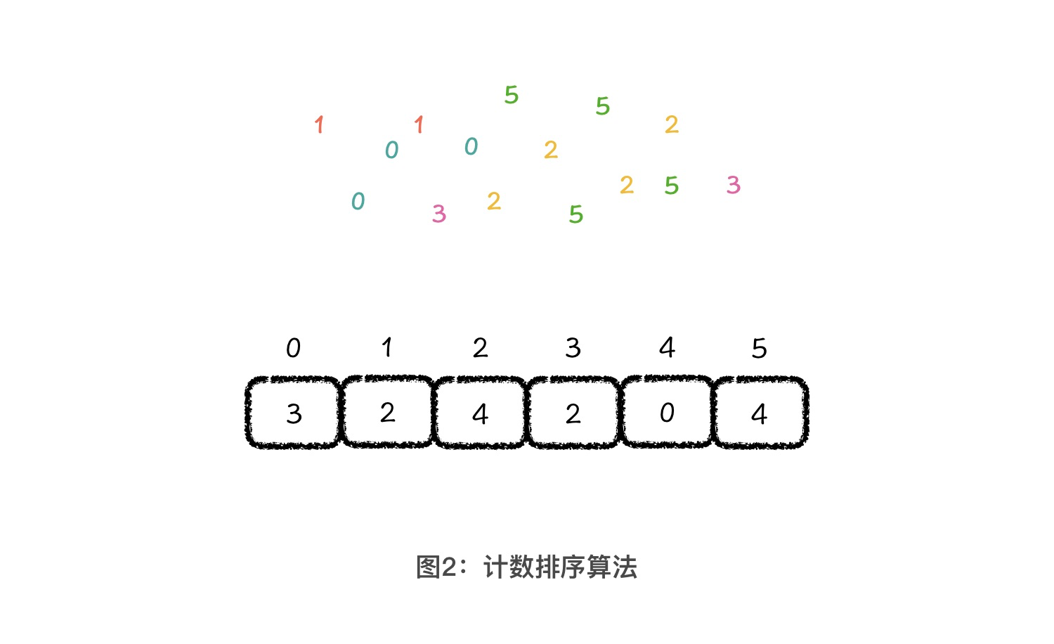 比如说,在面对一组无序的整数的时候,假设数据的范围在 0-5 之内,对于计数排序来说,只需要开一个大小为5的数组空间,数组的第 i 位统计的就是数字 i 出现的次数。结合上图的例子,我们可以统计得到 0 出现了 3 次,1 出现了 2 次,依次类推。这样,在输出的时候,我们只需要先输出 3 个 0,再输出 2 个 1,按照这个过程依次处理每一个数字的输出即可。