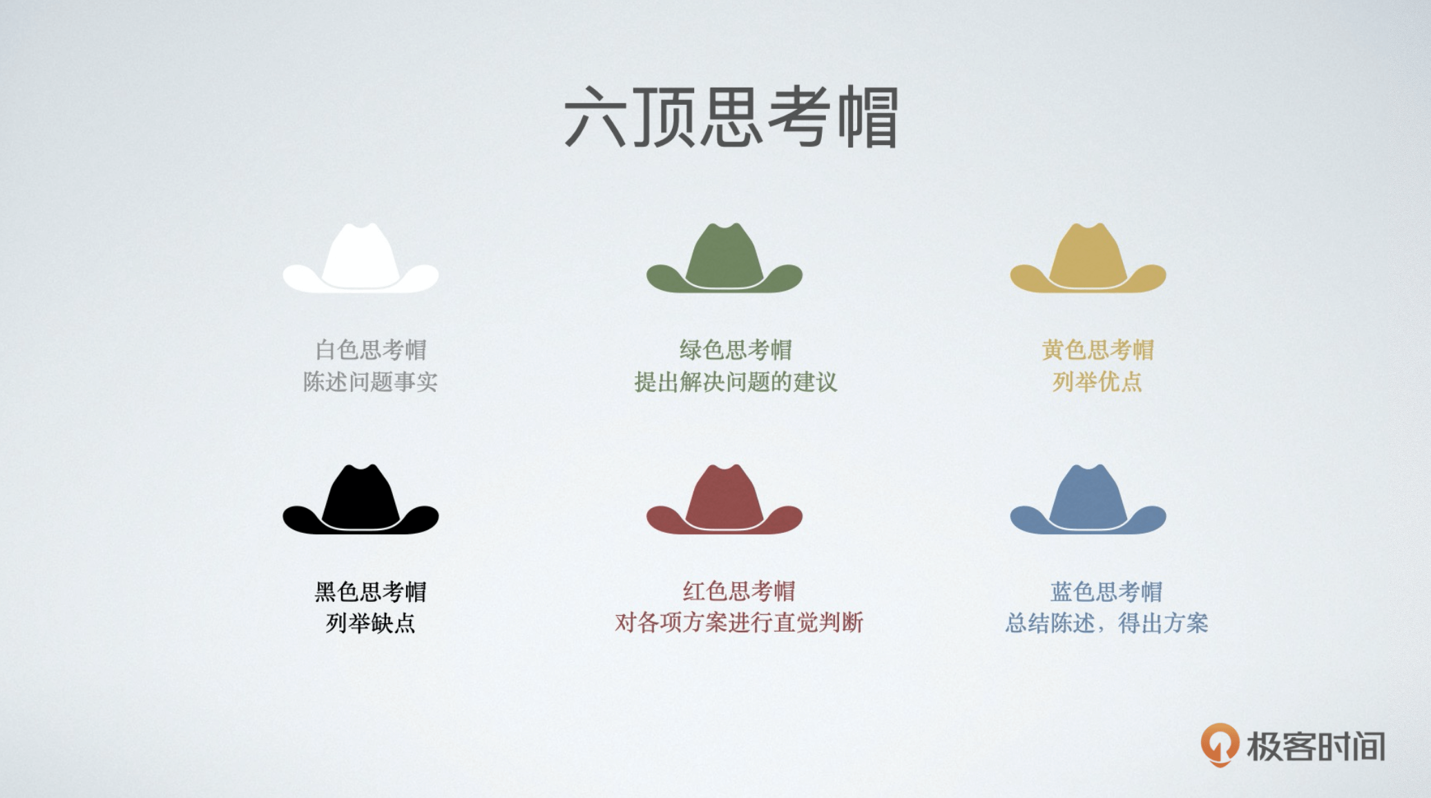 如果是相对比较复杂或者重要的事情,尤其是和战略相关的,比如某个业务该何去何从,是不是要研发某个新的产品等,我会动用一个简单高效的“六顶思考帽”模型来分析利弊。