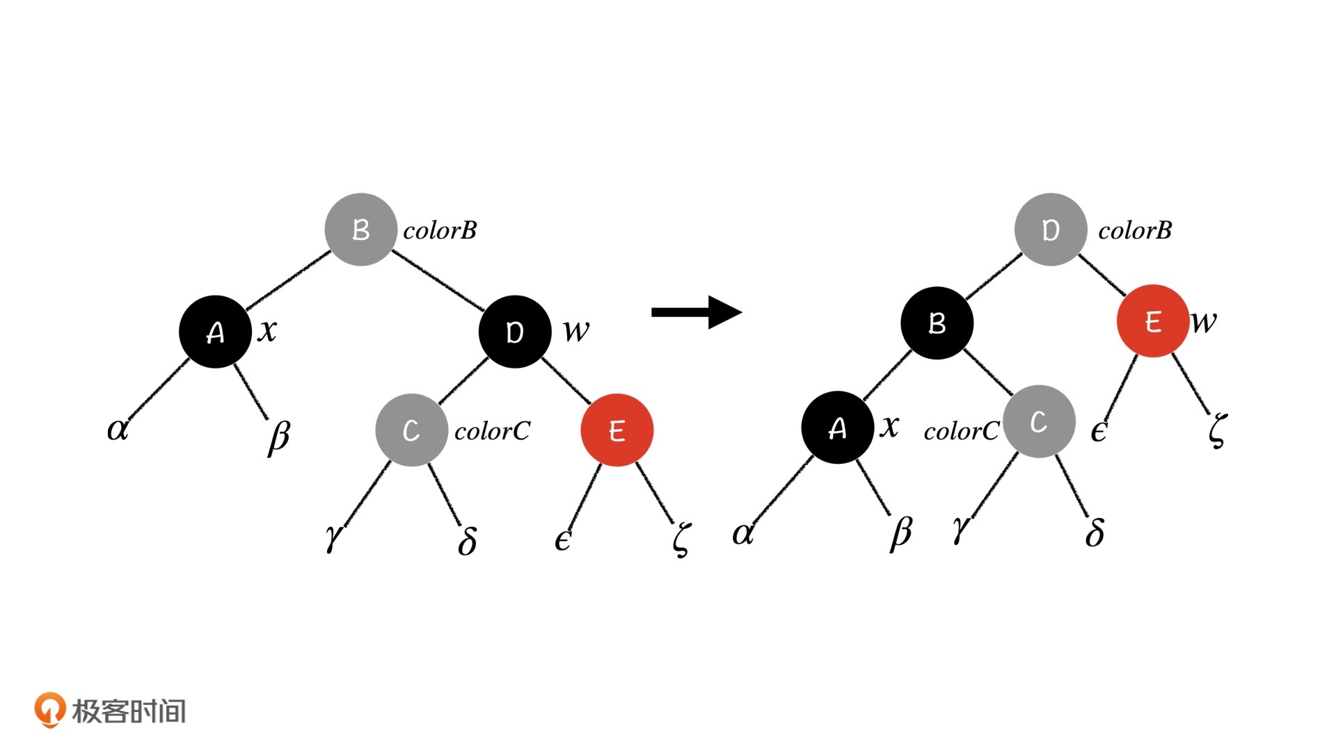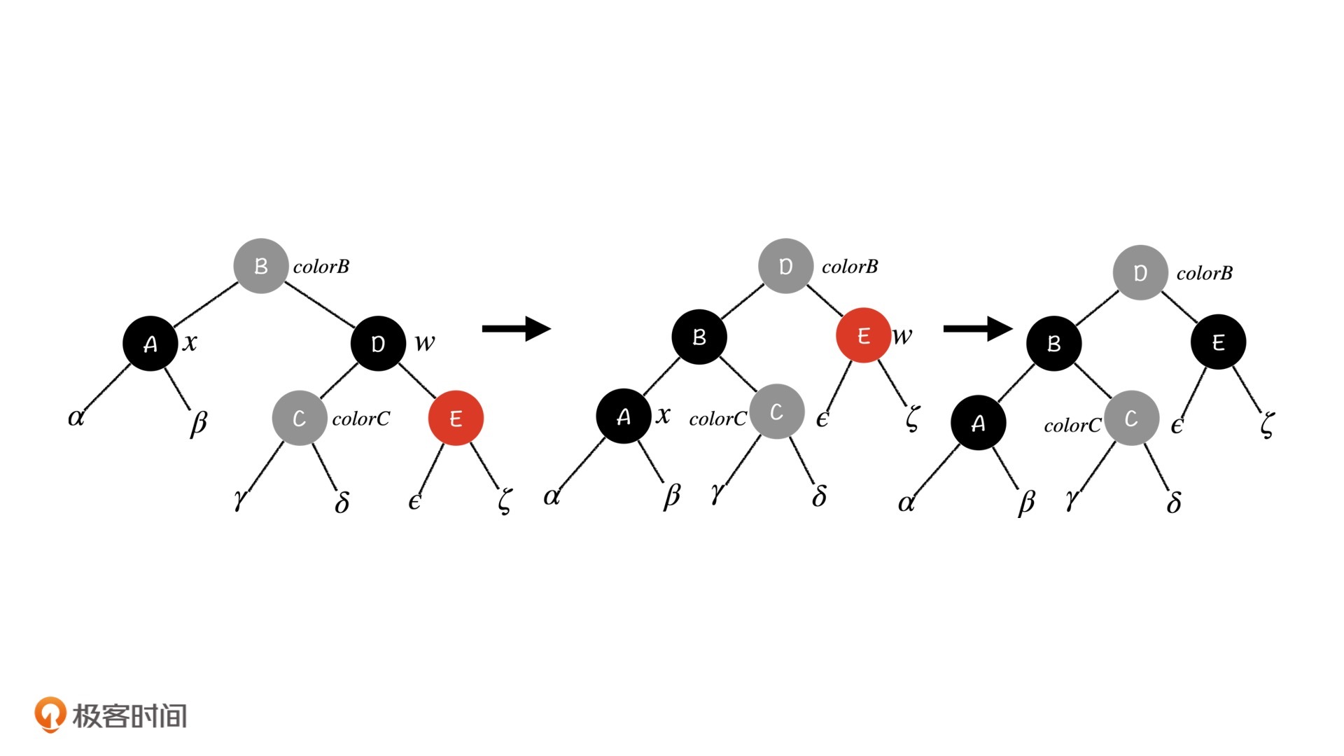 如上图,我们先进行了一次左旋操作,左旋之后又将D、B颜色互换,保持了C节点所在子树不受影响。这个时候,相比于初始情况,$\alpha$子树、$\beta$子树的阶(black height)多了一个,同时$\epsilon$子树、$\zeta$子树的阶又分别少了一个,所以E就可以直接分担A多出来的黑色了:我们将E染成黑色,再把A从特别黑变成黑色。最终子树的性质没有被破坏。