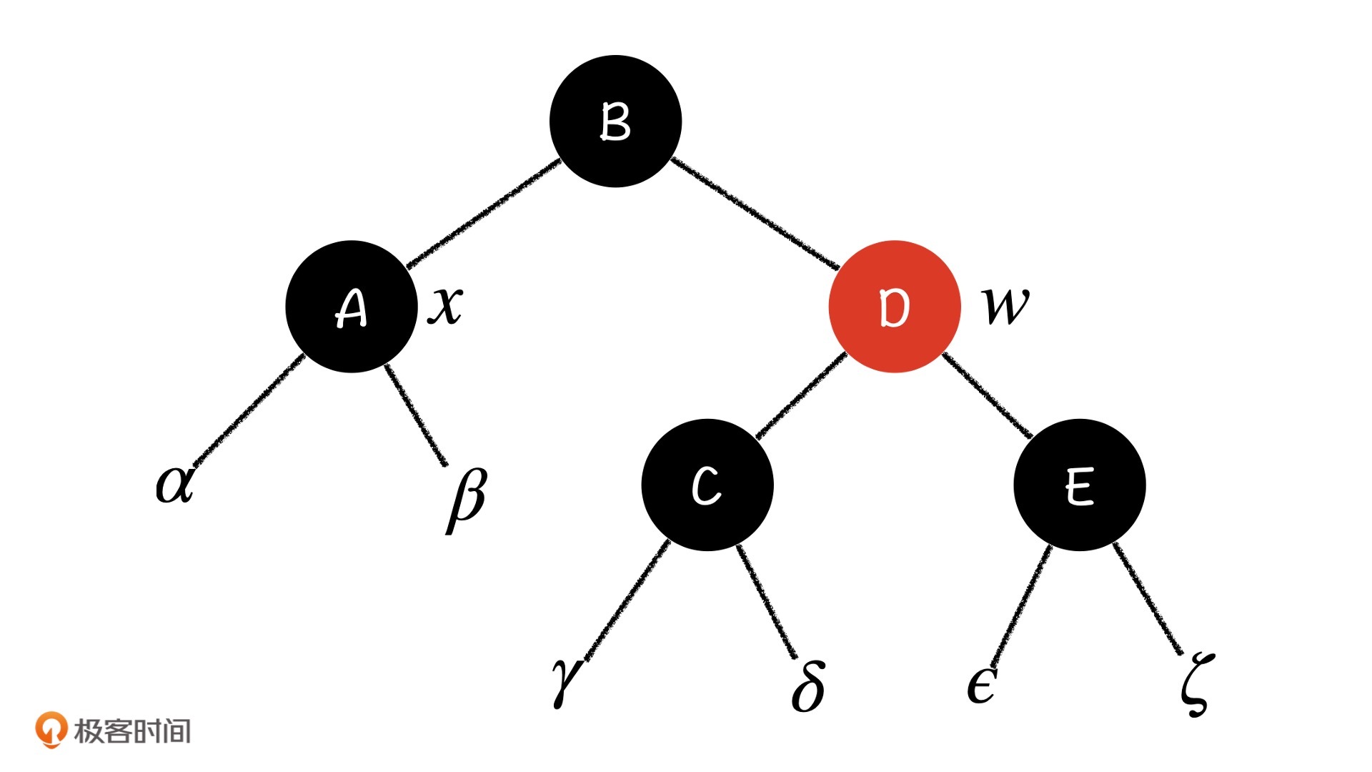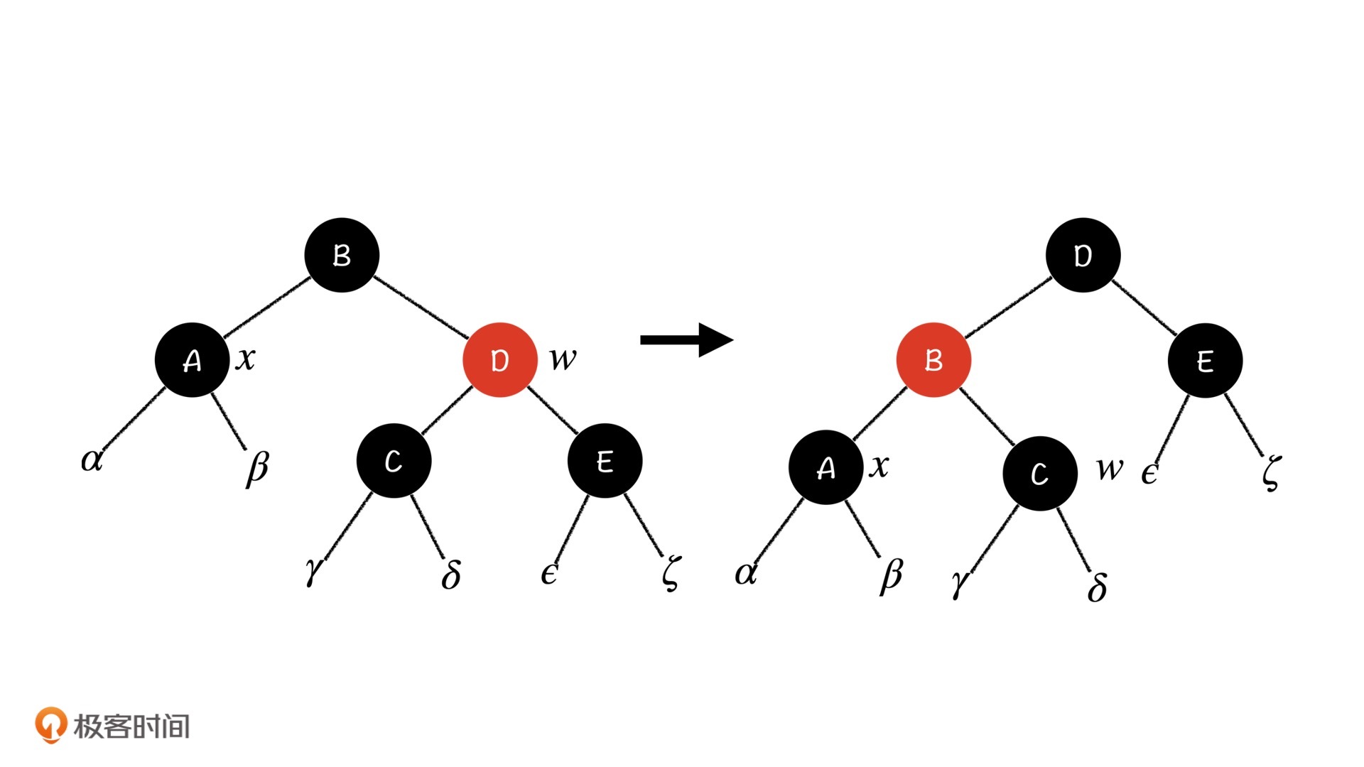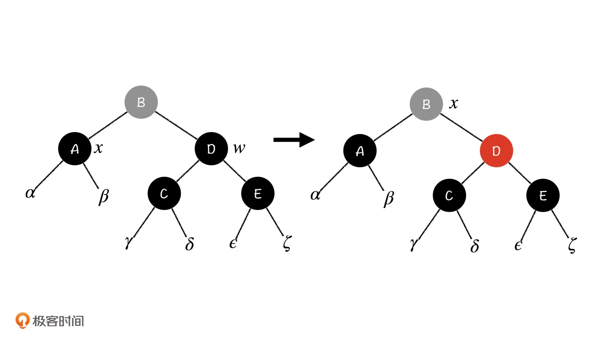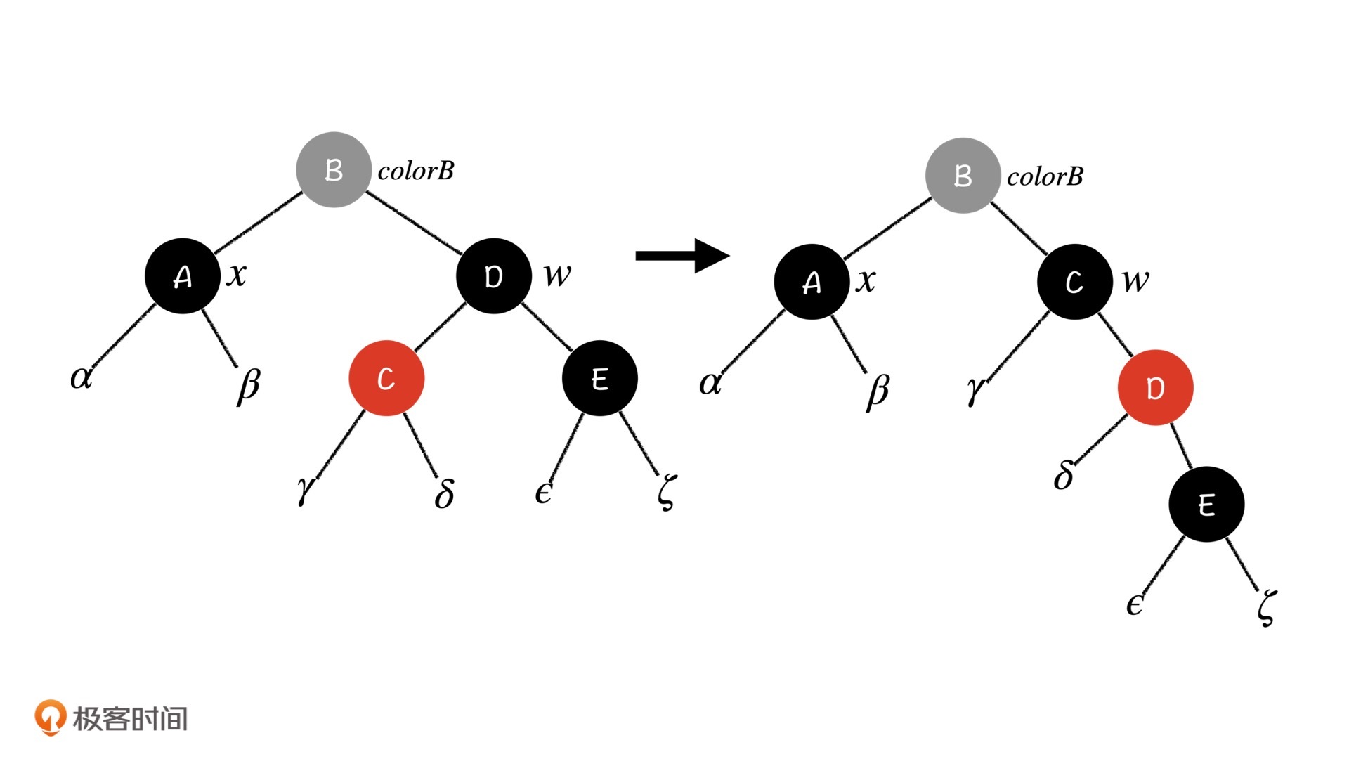 结合上面这张图,我们可以先通过右旋将红色节点变成w的右子节点,把它归化到第二种情况中。然后,我们再对D节点进行一次右旋。同时,为了保证$\gamma$子树和$\delta$子树的性质,我们将C节点和D节点的颜色交换一下。这样一来,这种情况就成功归化到了第二种情况中,我们用第二种情况的方法去解决它就好了。