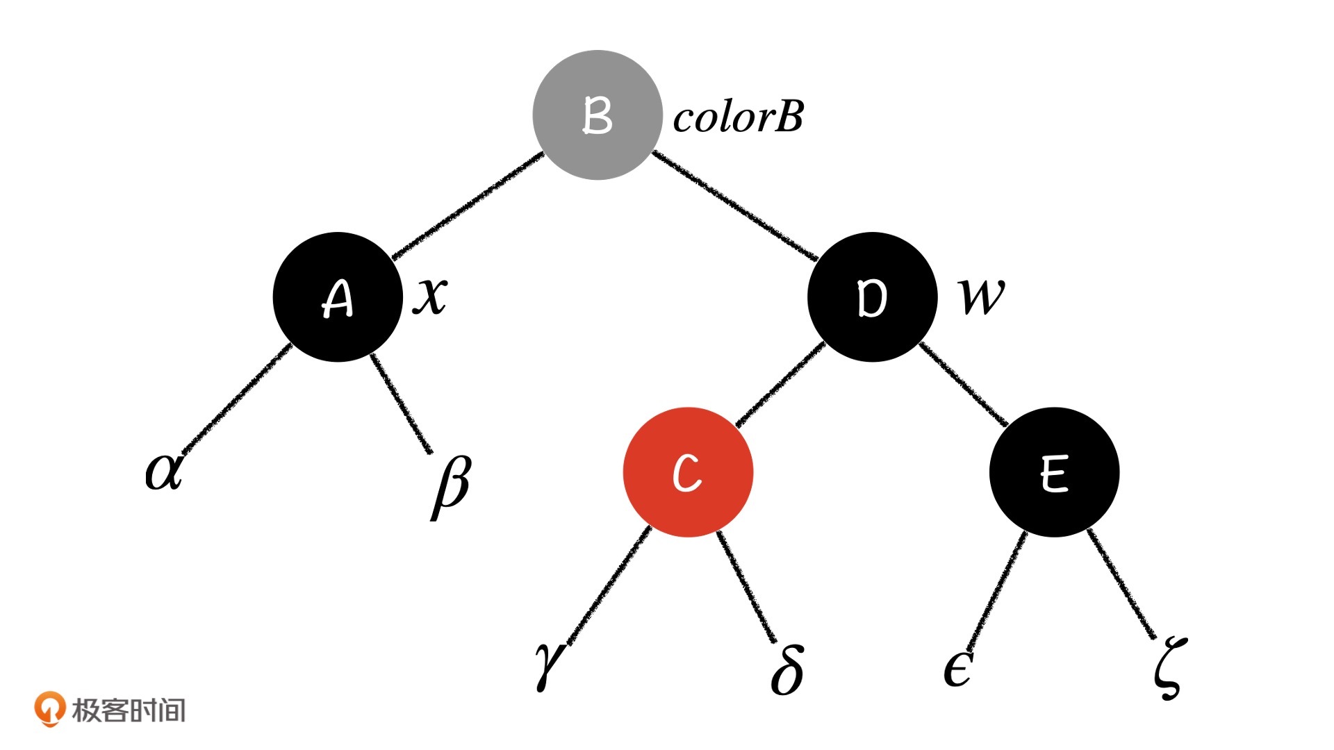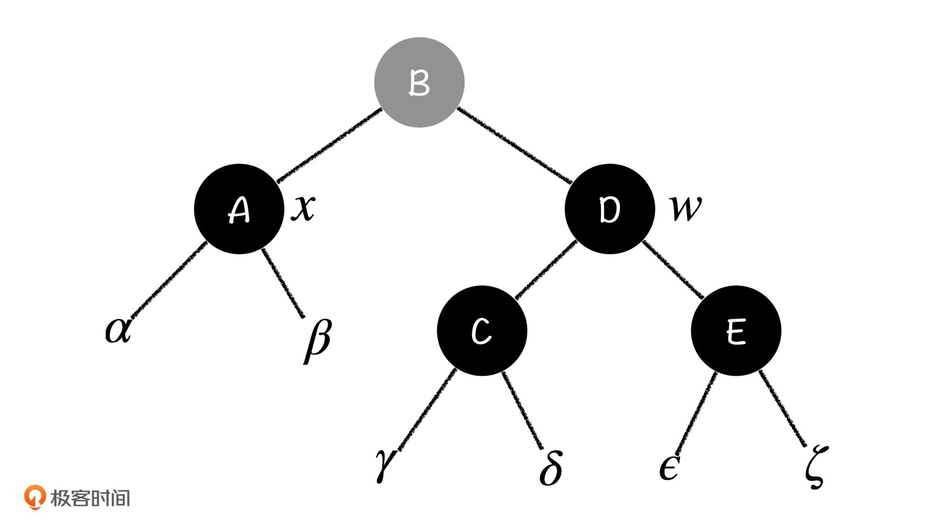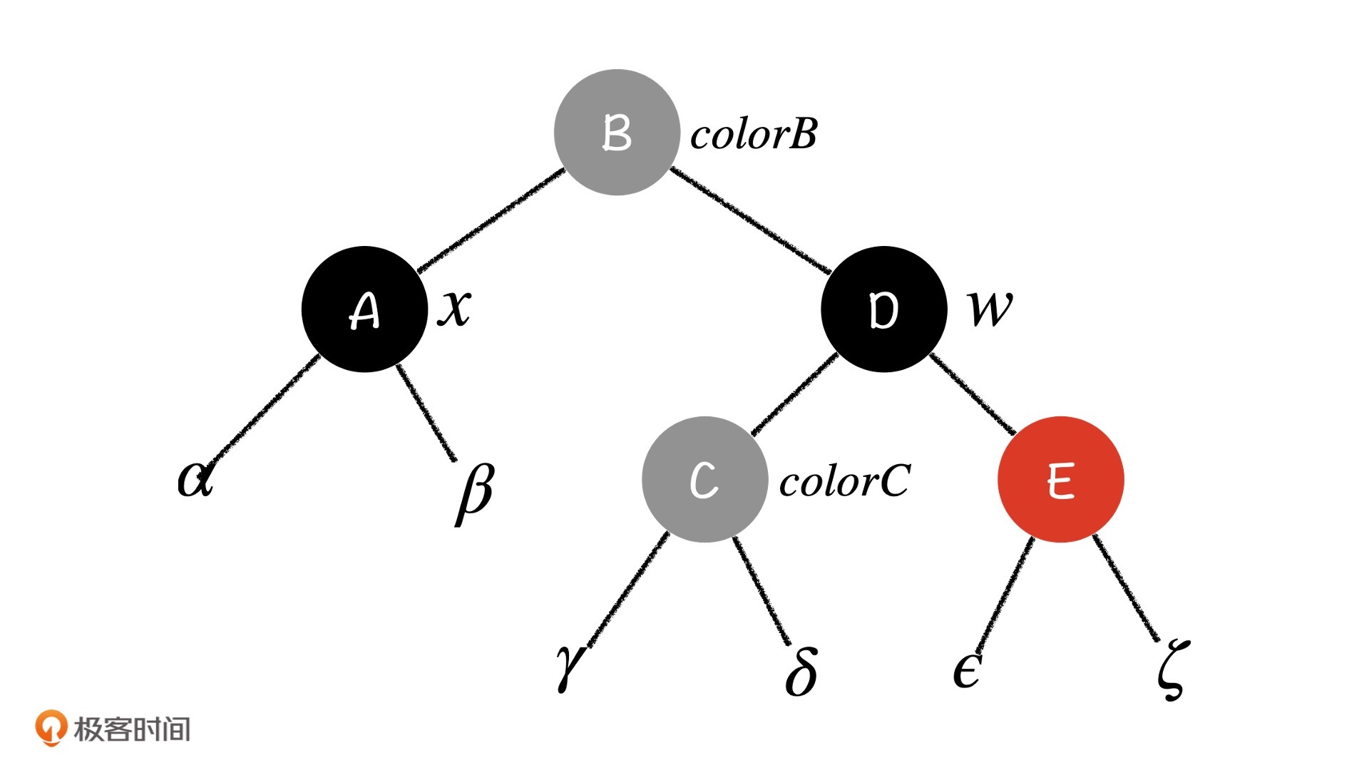 在这种情况中,我们还是想要利用红色节点分担掉x节点上多出来的那一重黑色。但是我们发现,红色节点E所处的位置很深,它是A节点兄弟节点的孩子节点,我们如果直接用E来分担,就必然会破坏掉整棵子树的性质。那怎么才能让E去分担这个黑色呢?