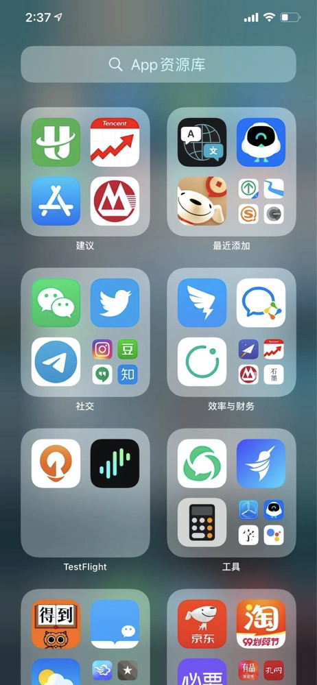 它根据 App 的属性进行了自动归类,比如社交、效率与财务、工具、信息与阅读、娱乐、教育等等,在这个基础上还提供了推荐(常用 App)、最近添加、TestFlight(如果有在测试的 App)的类别。其中大图标就是你使用比较频繁的 App,点击可以直接打开,小图标是直接打开这个类目下 App 的视图列表。App 资源库基本上体现了你平时在用哪些 App,大家可以自己看看,你的生命和时间,基本上就是消费在这里了。