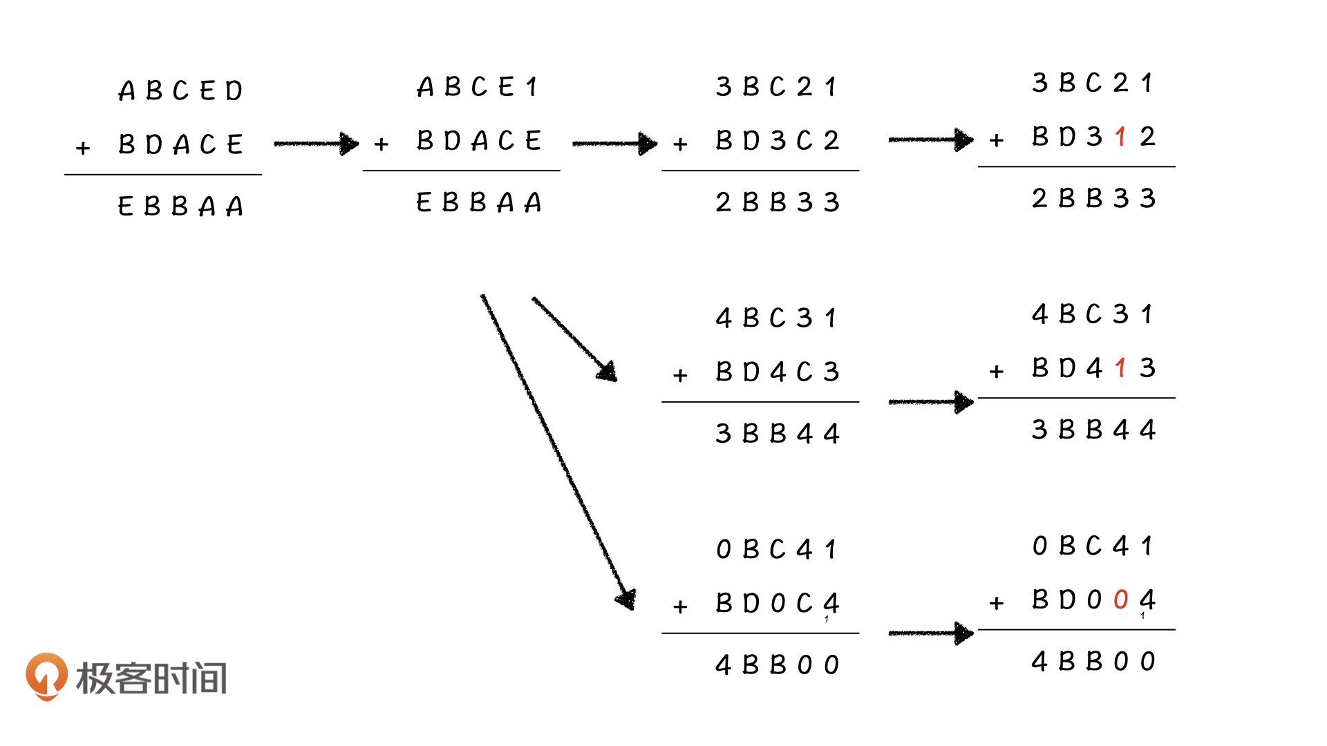 比如,在上面的算式中,由于两个数的和与两个数的位数相同,就说明最高位的两个数相加之后没有进位,则有A+B<N,同时也有A + B = E或A+B+1=E(考虑到B+D的进位)。