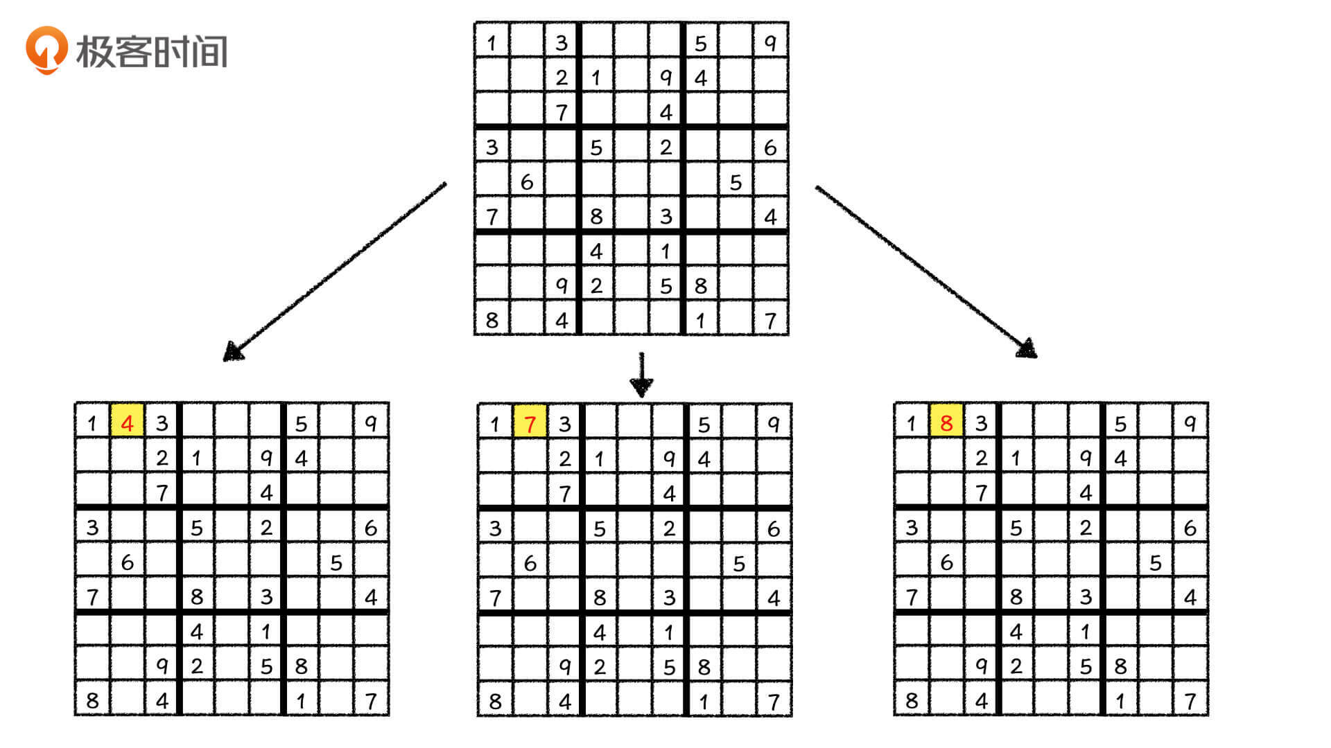 的确,直接这么搜索下去一定可以求出数独的解。但从实际的运行效率来讲,这种方法其实就是在碰运气。为什么这么说呢?在今天的例子中,第[1, 2]是第一个空格子,它可以填上4、7、8三个数字,我们要分别尝试依次把它们填到这个格子中。如果走到某一步走不下去了,我们还要再向上回溯,一步步走回来,回到数独最原始的状态重新进行尝试。也就是说,这个格子有几种可能性,我们就要重新遍历几次这个状态树。