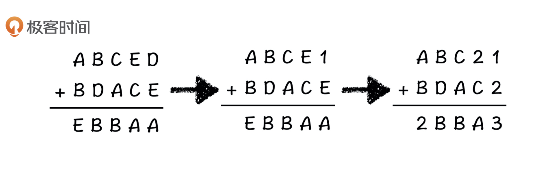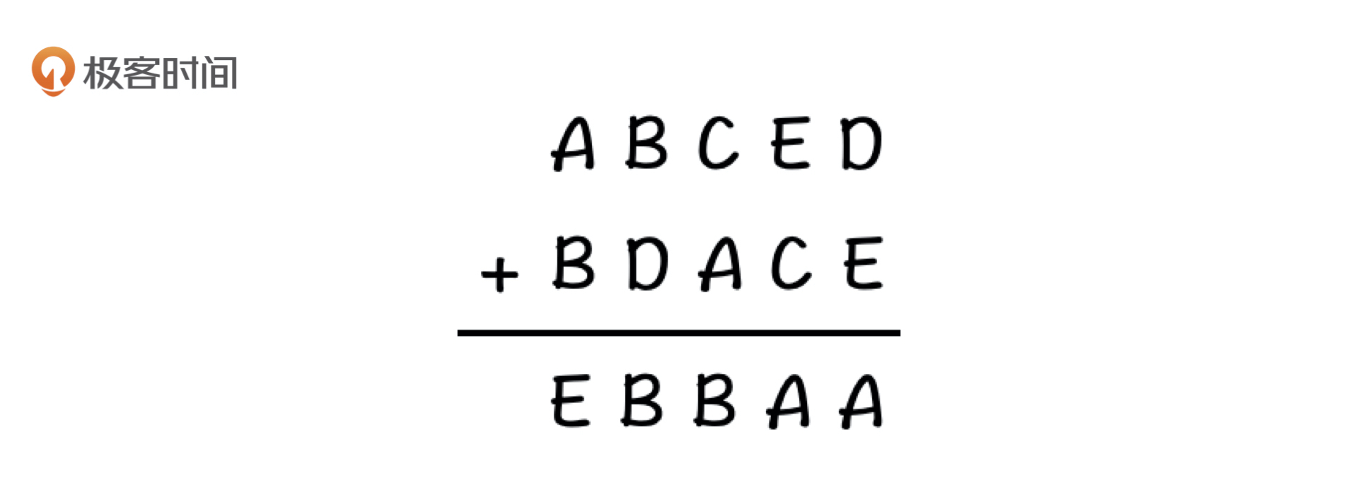 现在,我给出一个N进制的加法算式,其中N=5,让你用计算机来求出这个算式原本是什么样子的,你会怎么做?算式的形式如下(其中,不同字母的值不相同):