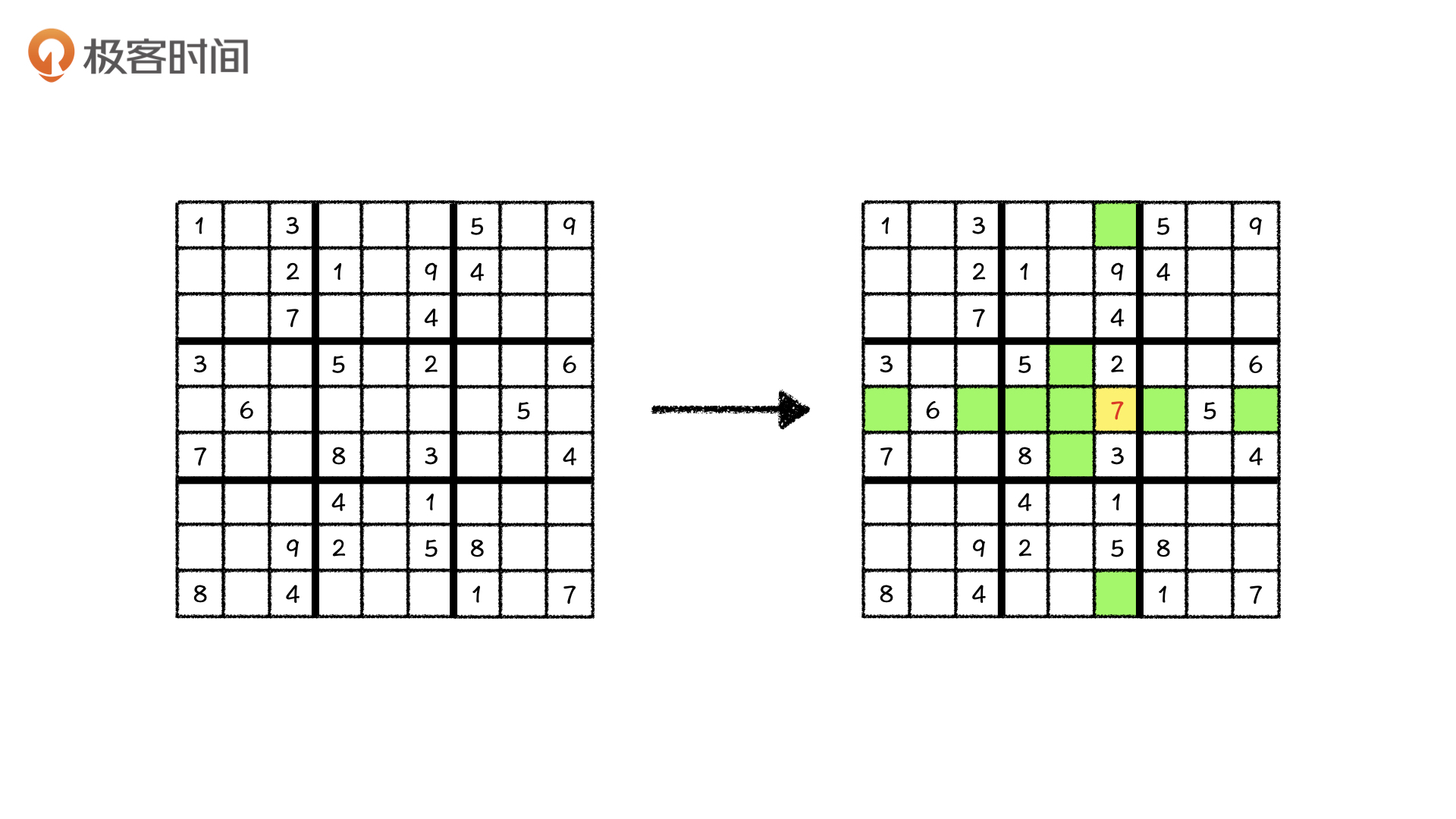 这么做显然非常浪费时间,就算在现实生活的数独游戏中,我们也不会这么去填数字。那我们在现实生活中是怎么玩数独游戏的呢?相信你和我一样,都会选择先填待选数字最少的那个格子。那当把一个格子填上之后,它同行、同列、同块的其他格子的可能行就都被占用了,这就相当于是在消减其他格子的状态数,这可以减少整个数独的不确定性。