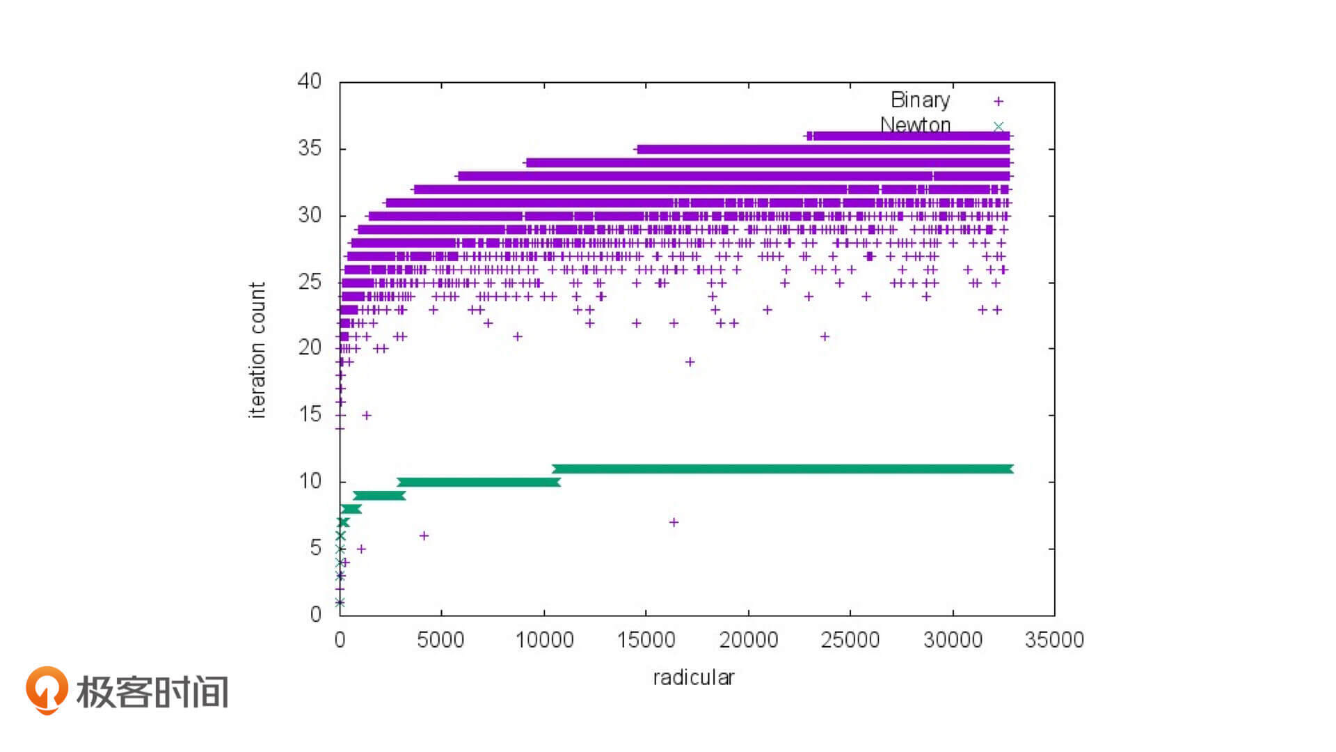 没错,我们仅仅经过5次迭代,就能计算出高于1e-6精度的结果。这不仅比二分法迭代次数少,计算结果的精度还高。如果我们的精度要求更高的话,二者的差距会更加大。实际上,有人确实做过二分法和牛顿迭代法在求sqrt的迭代次数对比,如下图: