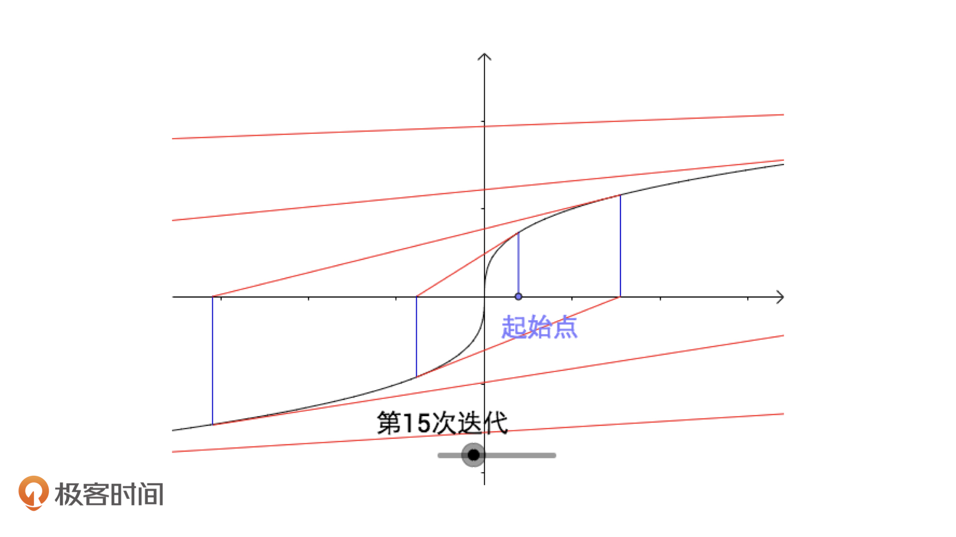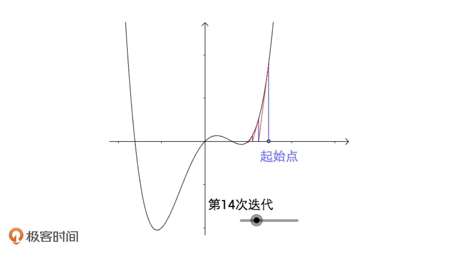 接下来,我就给你讲一种更常用、更快速的迭代求解方法,它就是牛顿迭代法。我们先从几何角度上来直观认识一下牛顿迭代法。