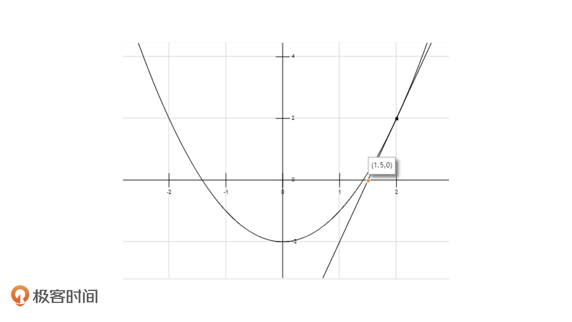 看到了吗,一下子$x_i$就离目标值近了这么多。接着,我们就以(1.5, 0)这个点为新的起点,再按照上面的方式用切线逼近一次,就能得到下面的效果。