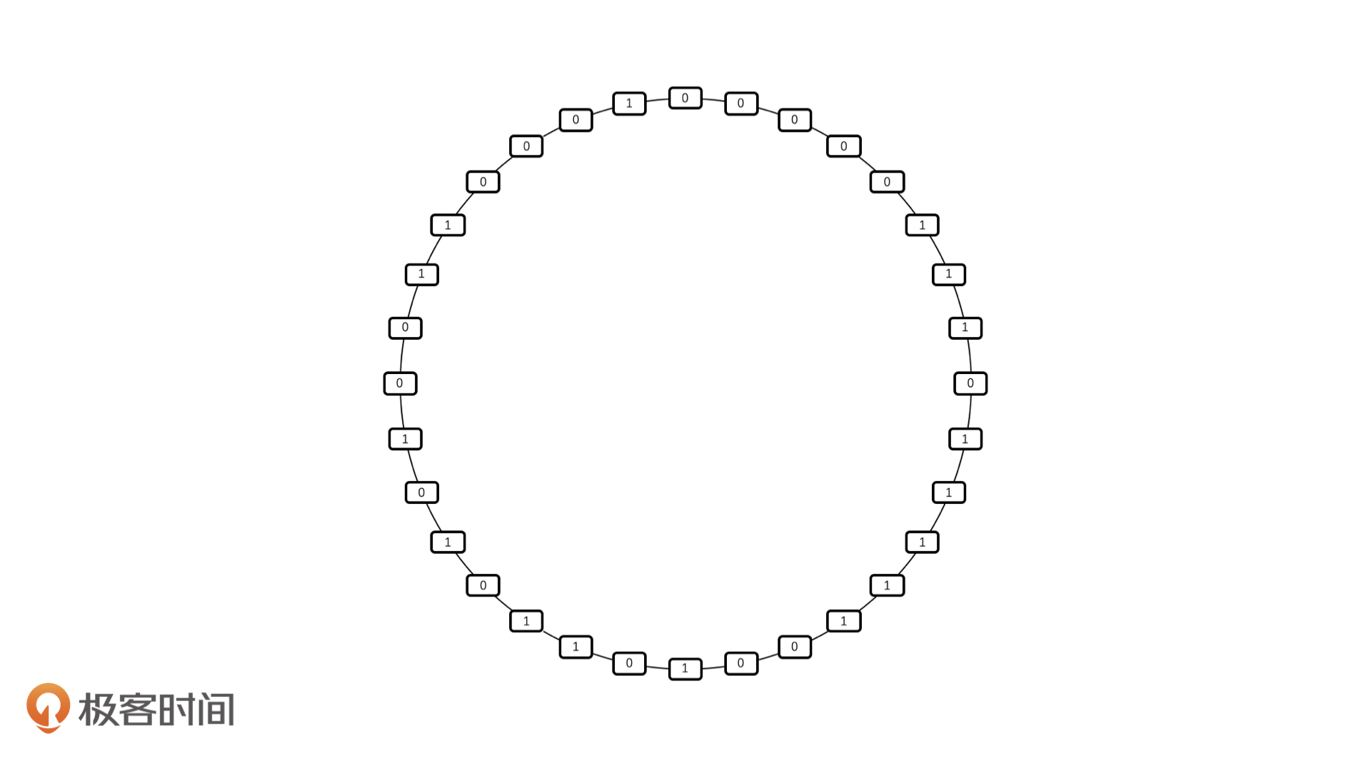 首先,一个整数是以32bit的长度存储在计算机中的,如果不算符号位,它的最高5位,一共有多少种情况呢?自然是32种情况,从00000到11111。我们将常量0x077CB531展开成二进制表示,就是00000111011111001011010100110001。我们将它看作是一个循环的圆,然后从中依次取出相邻的5个bit,如下图: