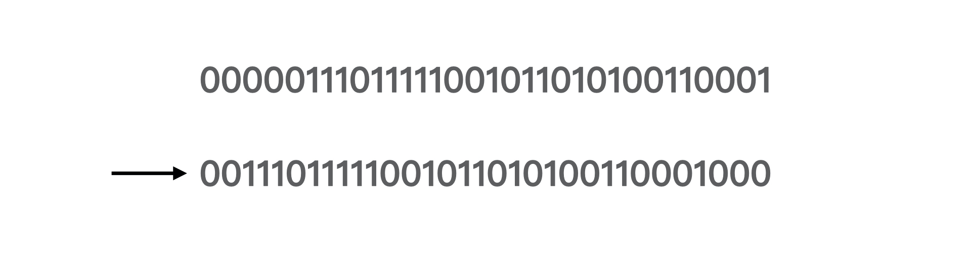 我们看到它的前五位是00111=7,查表可以看到MultiplyDeBruijnBitPosition[7]=3,结果是正确的。那如果左移超过了27位呢?其实也没有关系,这个常量的前5位都是0,左移也是用0来补低位,所以刚好形成了循环。