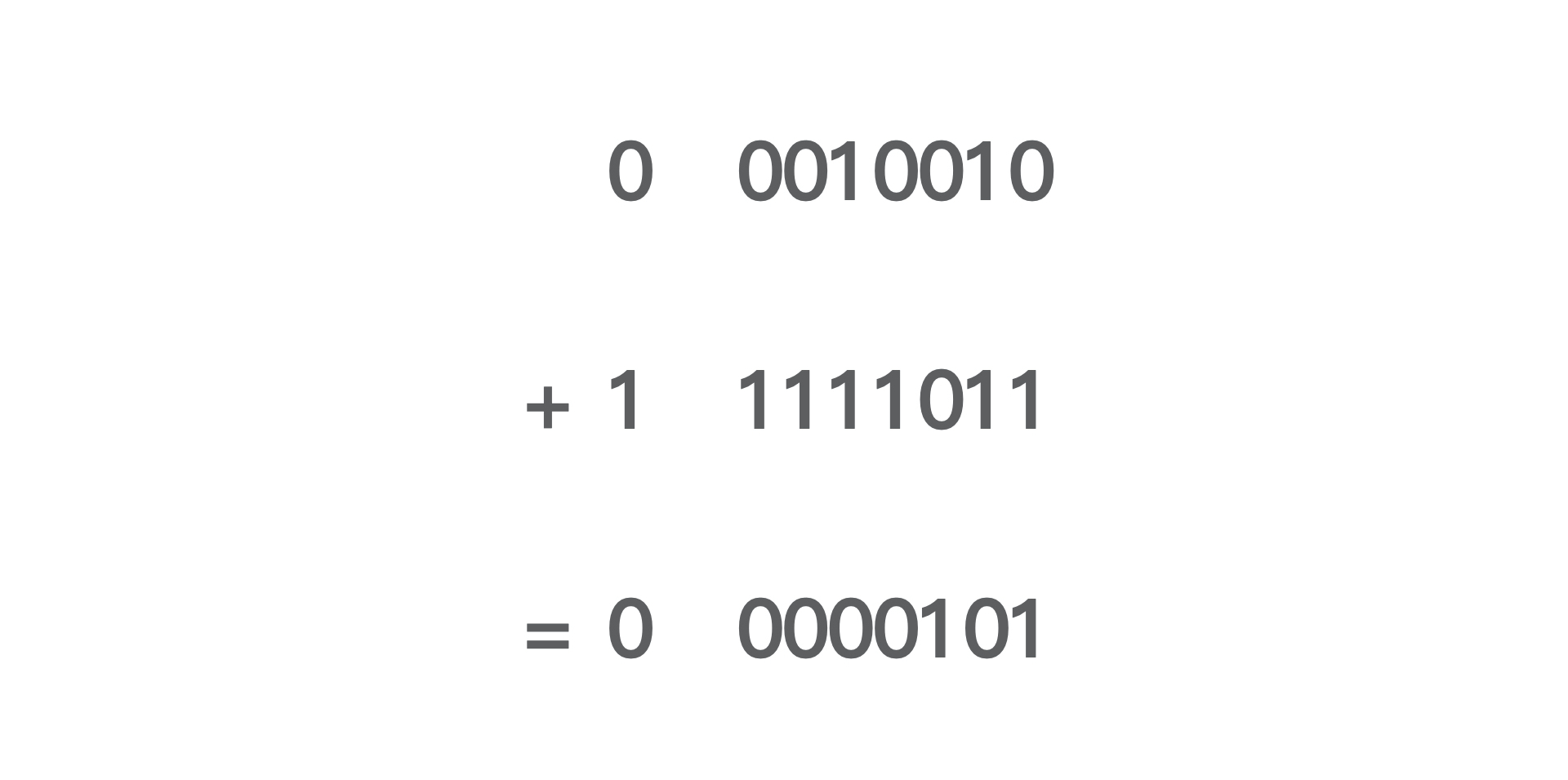 我们再看一个补码的计算例子,这次,我们要计算18-5,在计算机中就是18+(-5),而18的补码表示是0 0010010,-5的补码表示是1 1111011,最终的结果0 0001101也就是13。