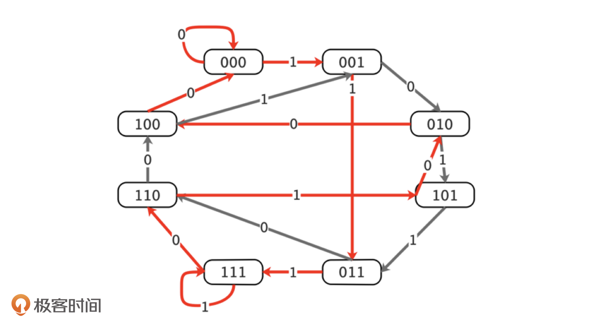 我们发现,图里面刚好有16($2^4$)条边,而且每一个边的编号还都是不一样的,它们刚好对应了窗口为4的所有情况。这是不是就说明,如果我们能够找到一条回路,它途径这个图中所有的边一次,就找到了一个新的序列B(2, 4)呢?没错,这个回路就是欧拉回路。而欧拉回路就有比较快速的解决方法了。欧拉回路的具体概念你可以课后自己去深入学习,对于今天的问题,我们只需要了解到这里就可以了。