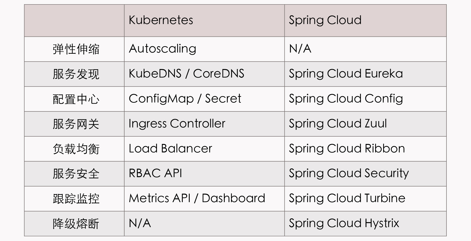 针对同一个分布式服务的问题,对比下Spring Cloud中提供的应用层面的解决方案,以及Kubernetes中提供的基础设施层面的解决方案,你就可以明白其中缘由了。