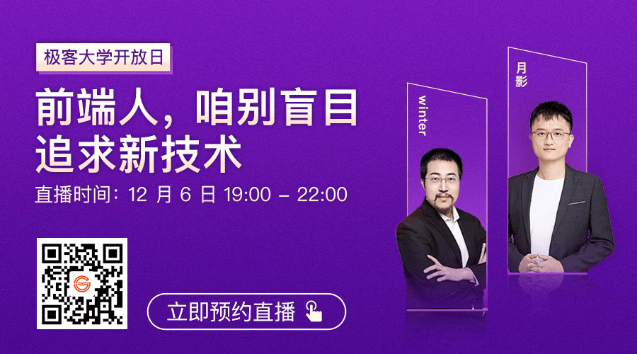 对了,如果你是前端人,那我再给你推荐一个活动。本周日(12月6日)晚7点,我们会组织一次大型公开课活动,主题是 “前端人,咱别盲目追求新技术”,特别邀请了winter以及前奇虎 360 奇舞团团长月影,和你聊聊这个曾经或者正在困扰你的大话题。另外,我们还邀请了字节跳动前端团队进行线上招聘,如果你感兴趣,可以带着简历过来哦。更具体的直播信息,你可以点击文末图片查看。